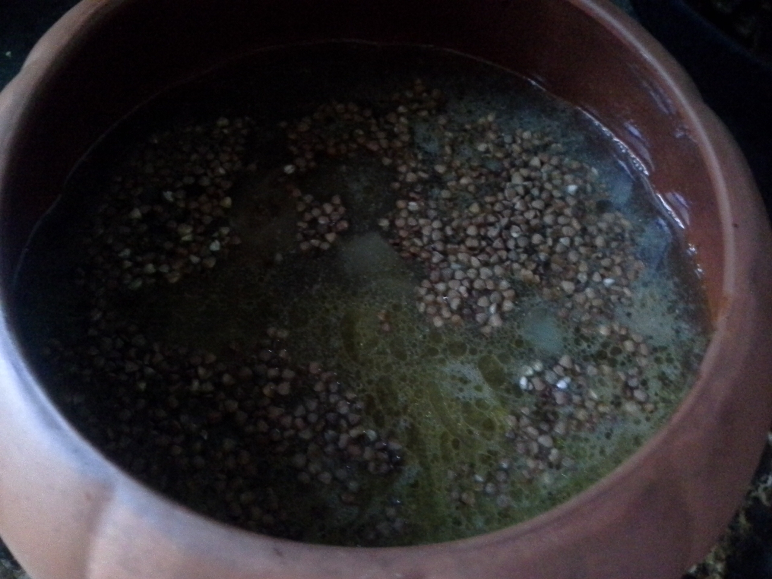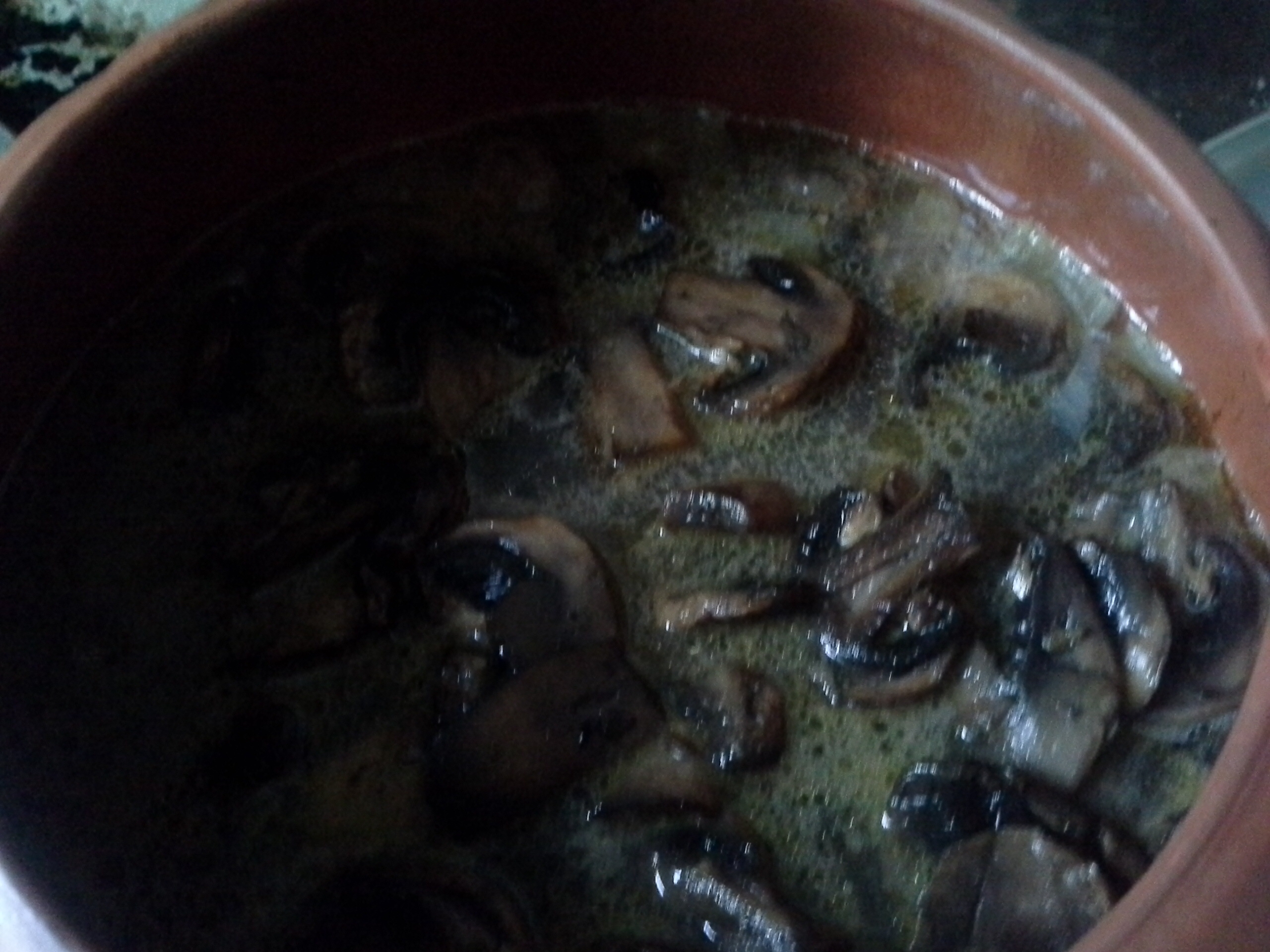 Жарим грибки. В горшок, без фанатизма, насыпаем гречку. Доливаем полтора объема кипячёной воды ( от объема гречки ) мясо дало восхитительный сок. Ещё немного тушим, добавляем грибки и доводим кашу до полной готовности. PS Солил и перчил мясо в самом начале. Температура духовки 149 градусов.
