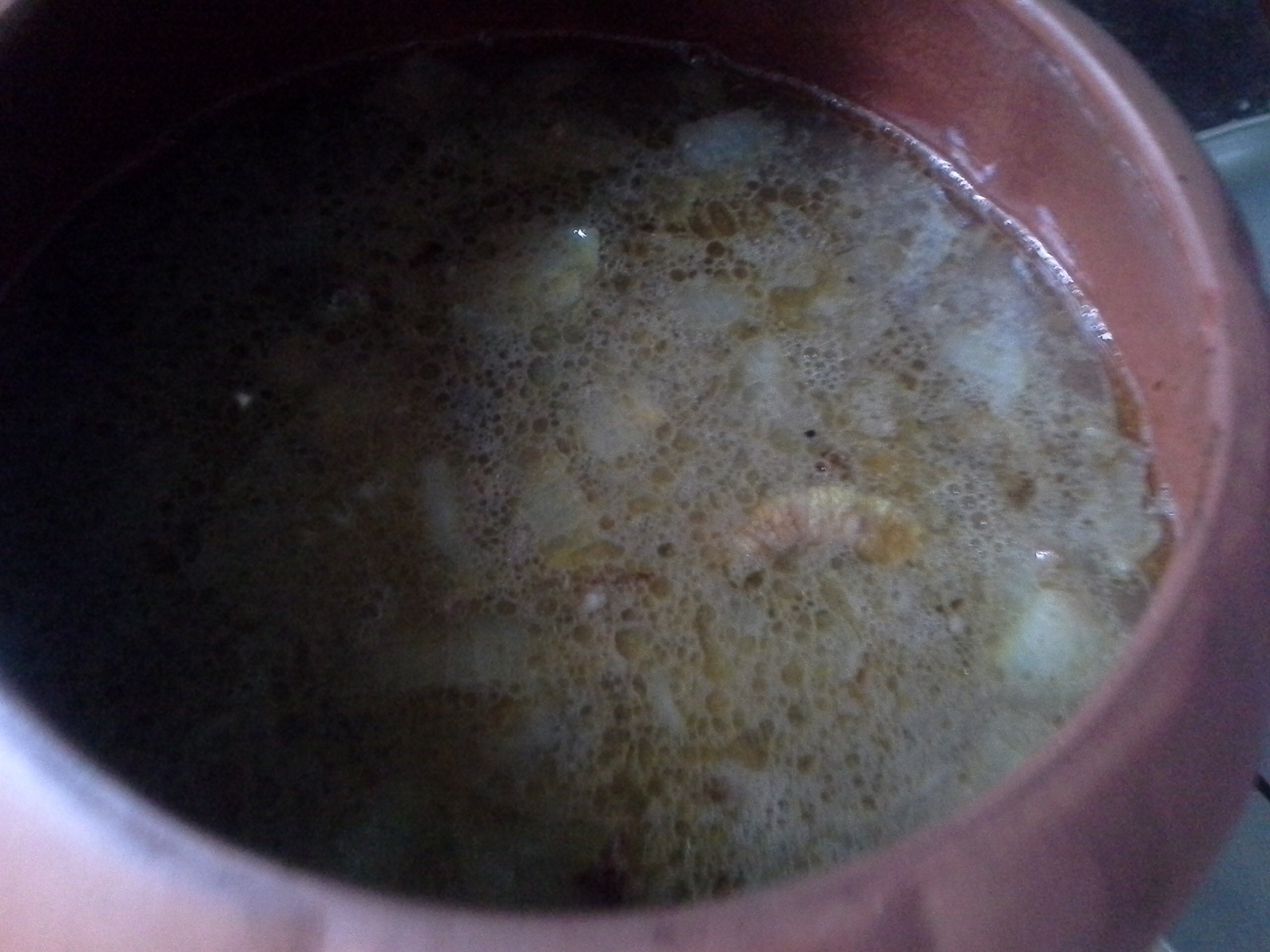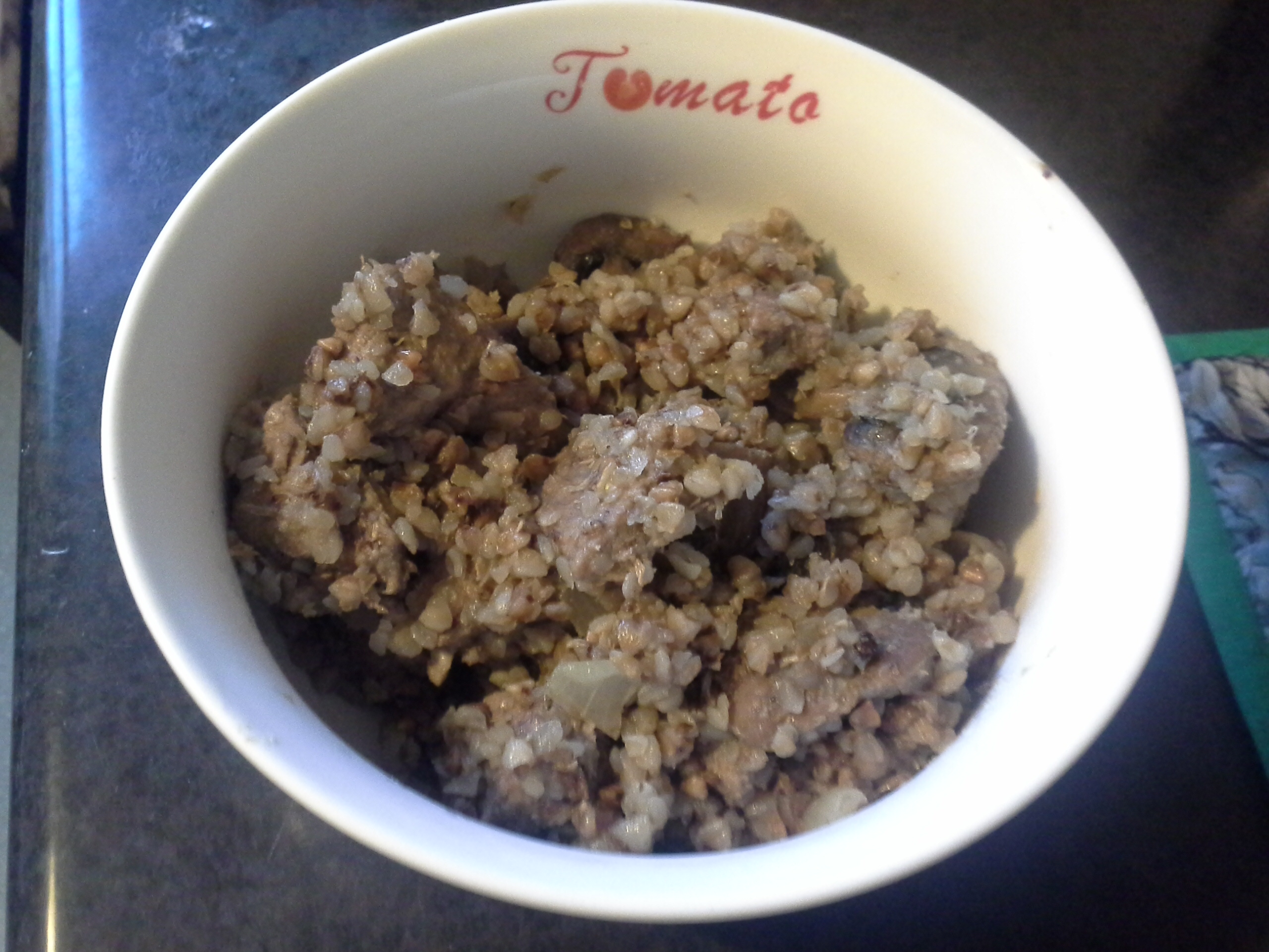 Каша гречневая, диетическая. Спецпаёк. Берём кусочек баранины, режем на кусочки, что бы в ложке умещался. Две луковички обжариваем до приятного цвета и откладываем в другую посуду.