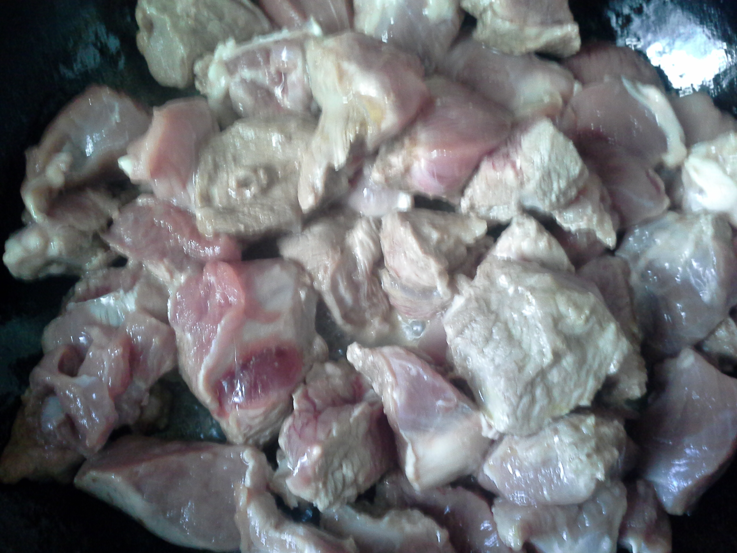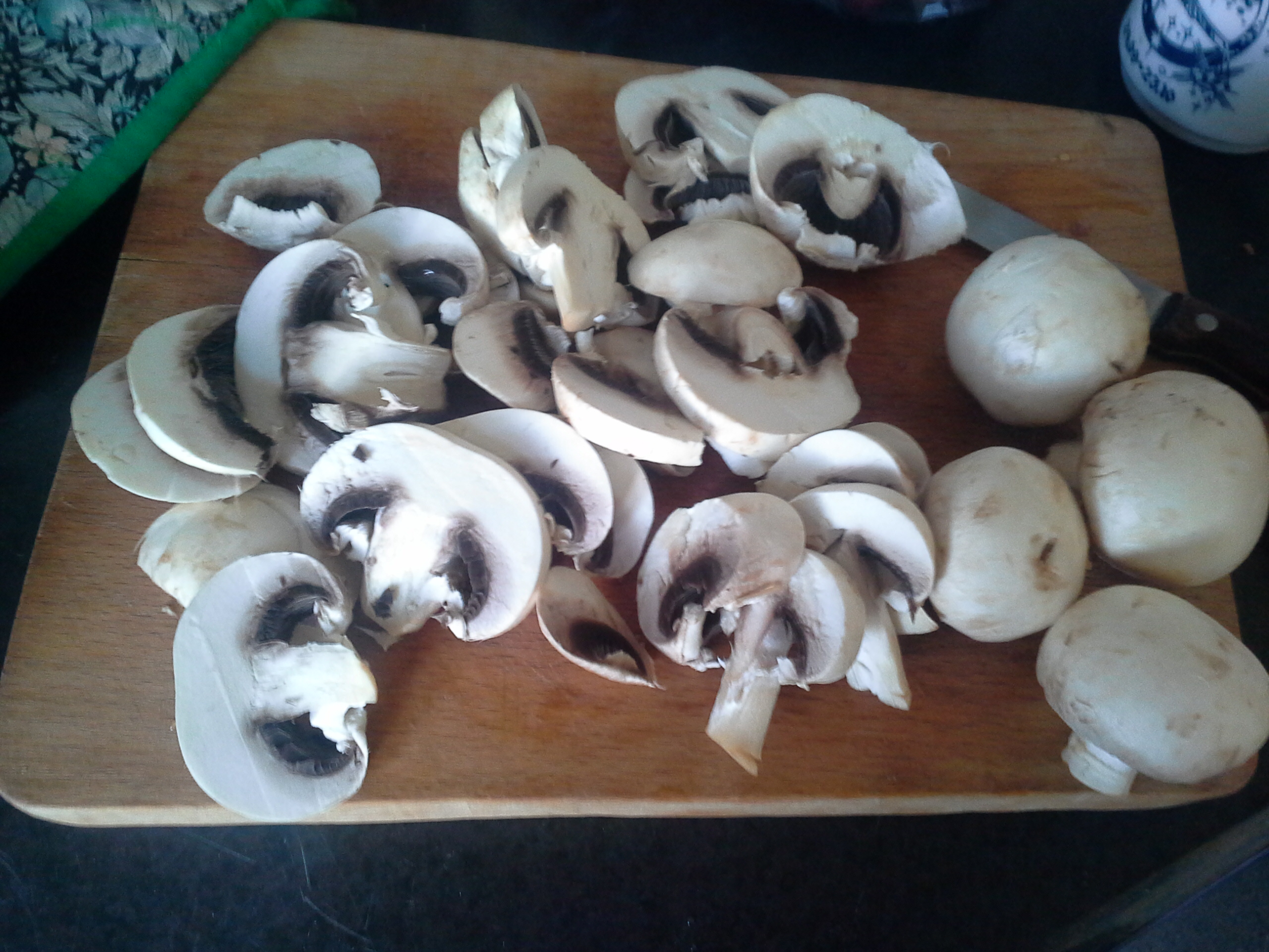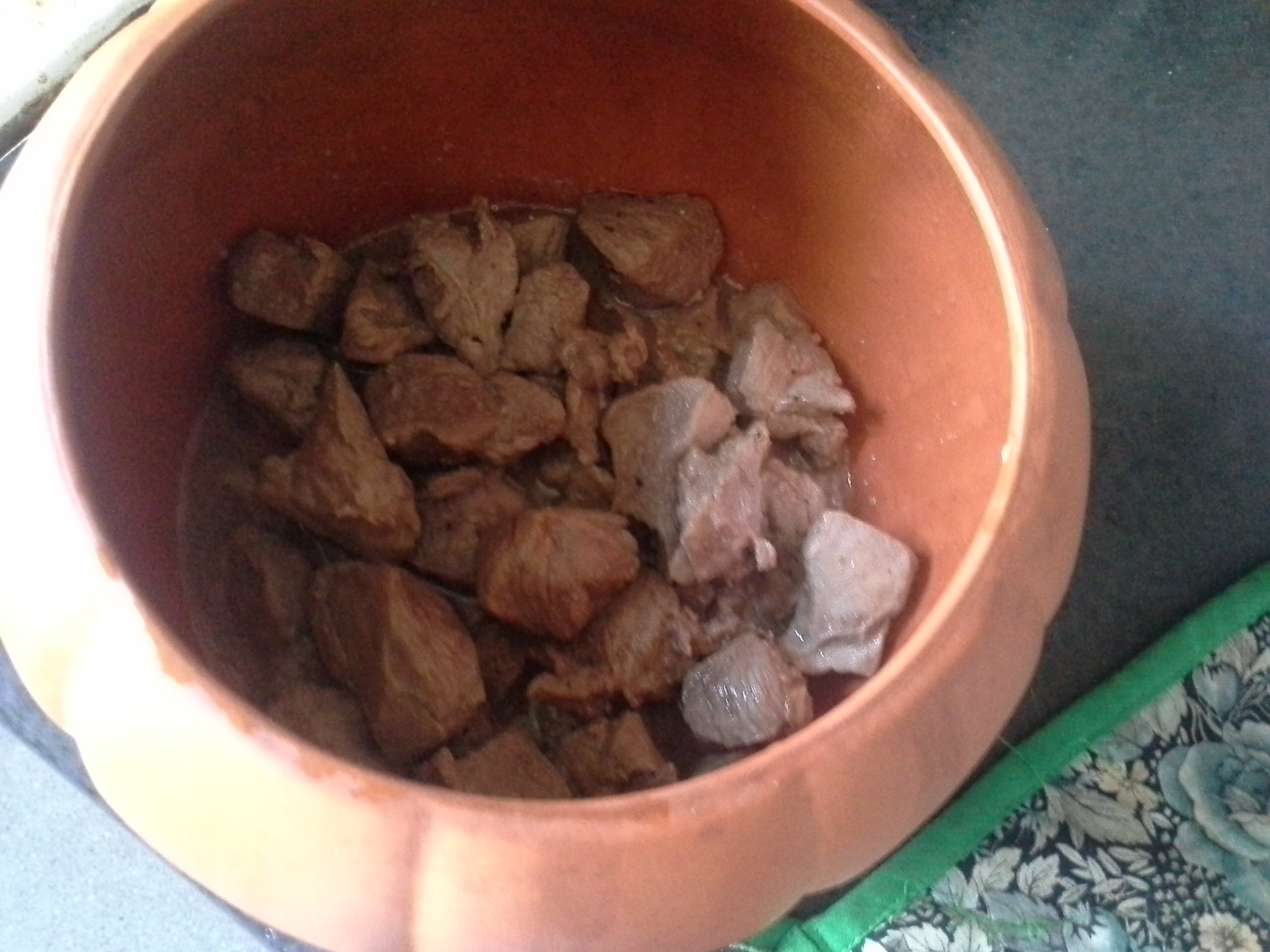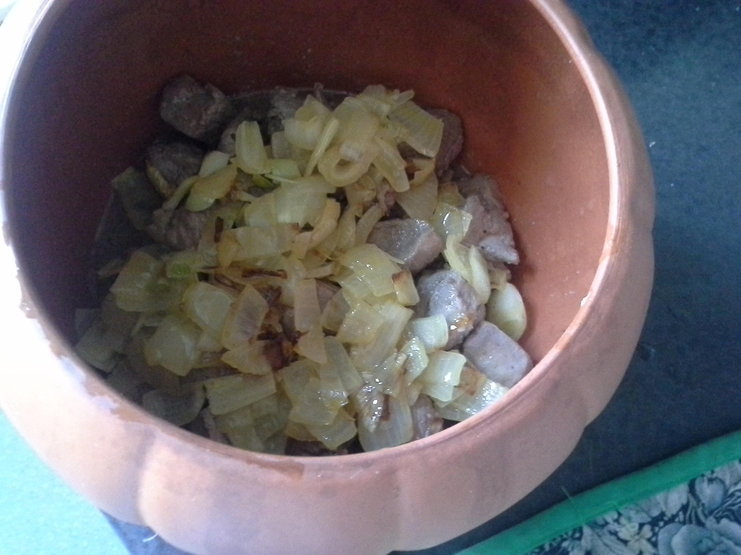 Режем грибки. На тойже сковородке обжариваем и немного тушим мясо. Далее мясо в горшок и тушим в духовке. Добавляем лук.