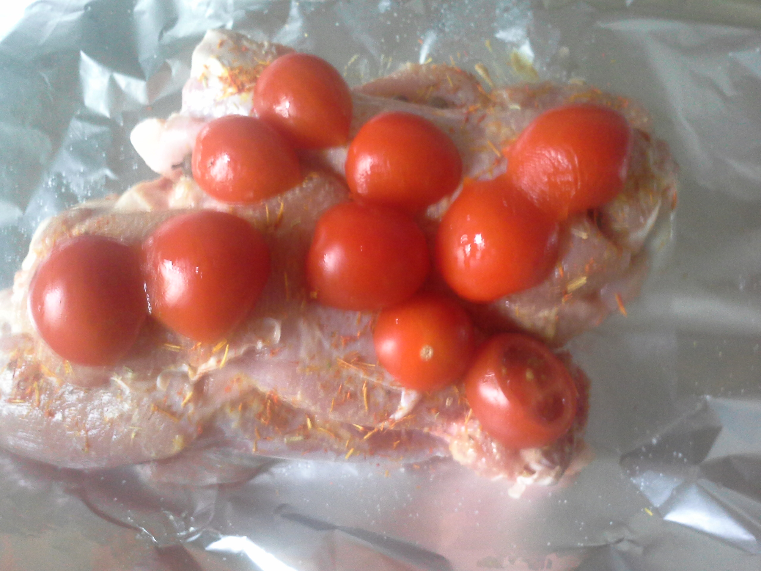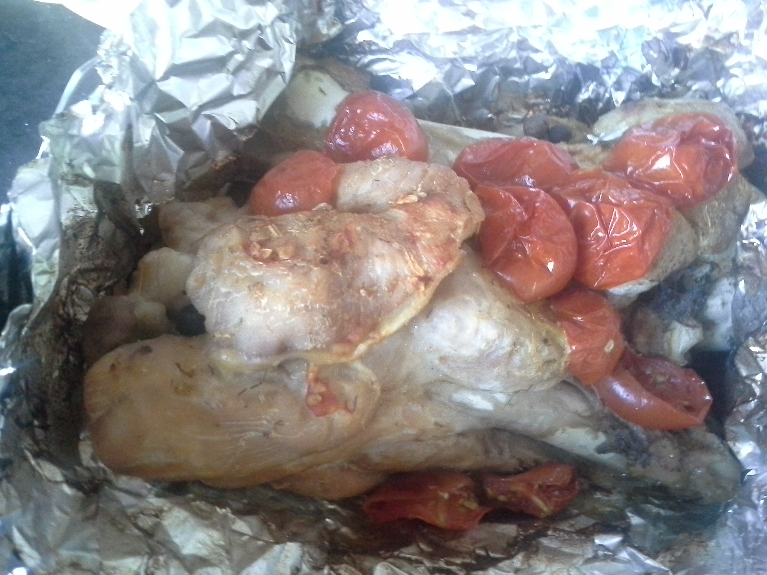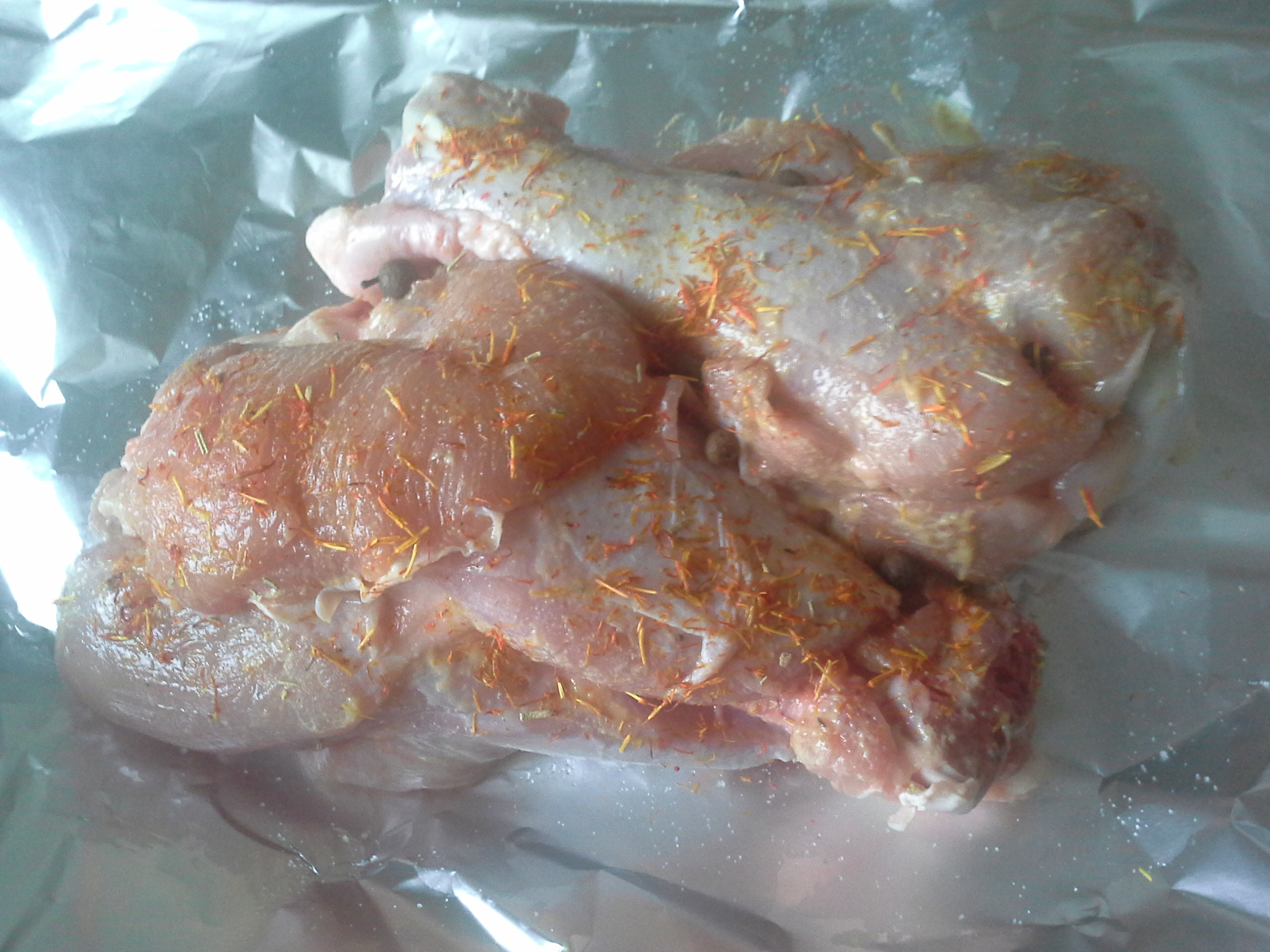 Состав простой. Два плеча индейки, срезал кожу, посолил, смазал горчицей, добавил душистого перца, розмарина, шафрана, помидоров. Оставил их на полчаса вместе, чтобы он прониклись моей кулинарной идеей. Потом пойдут в духовку, запекаться. Сразу заявляю - будет очень вкусно! Потому, что жрать охота страшно!