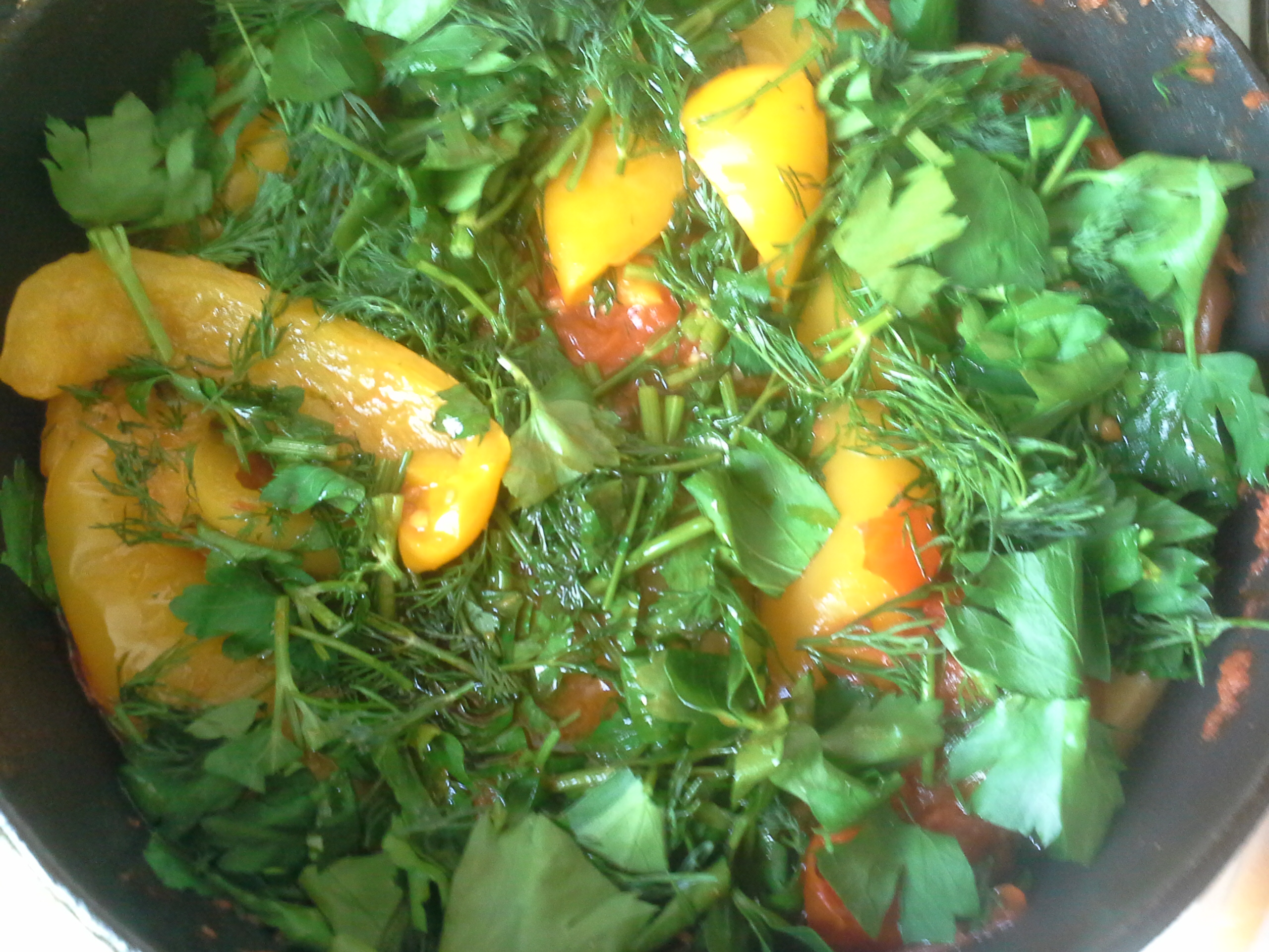 Этап второй Приврал малёха, когда всё почти запеклось, добавил томатого сока из банки помидоров в собственном соку.