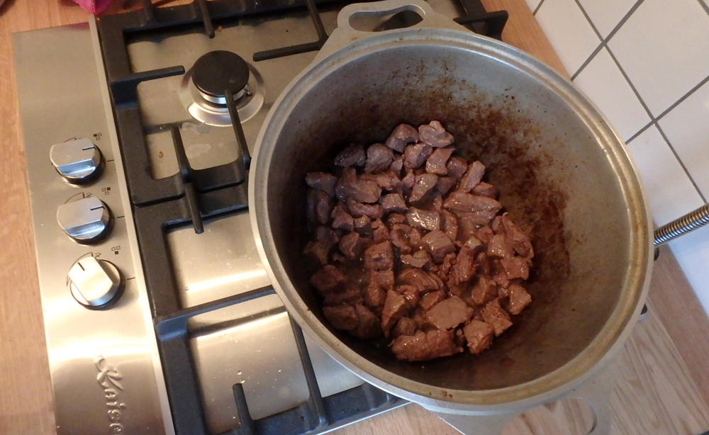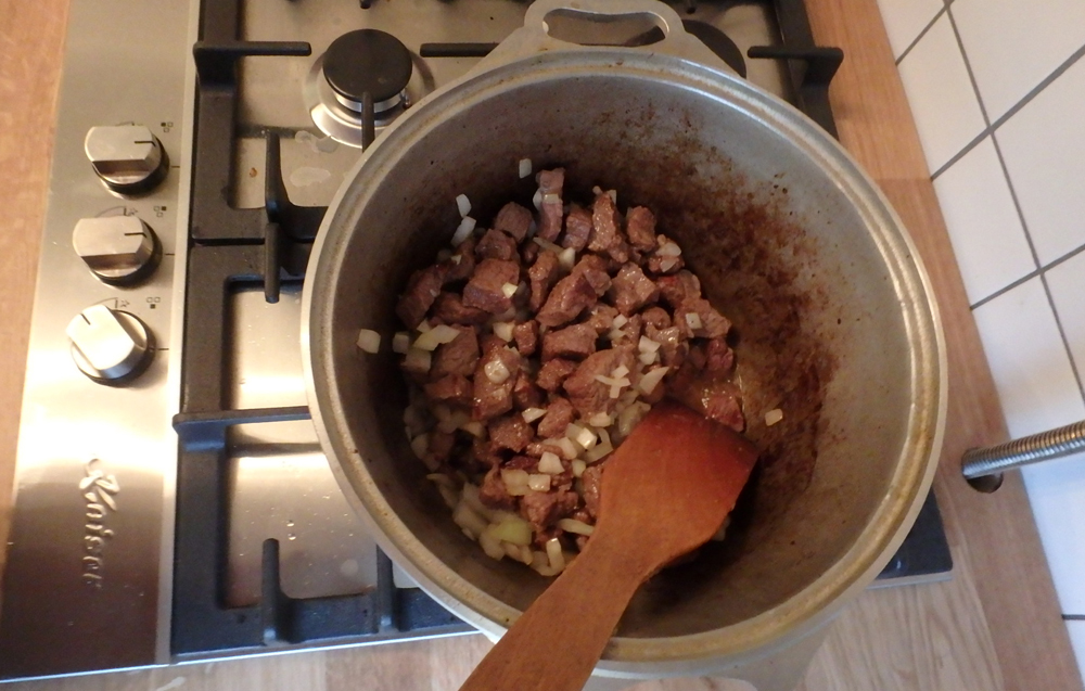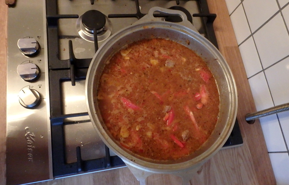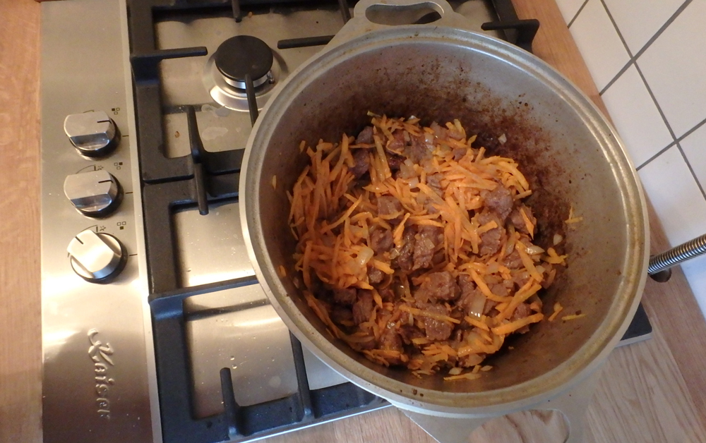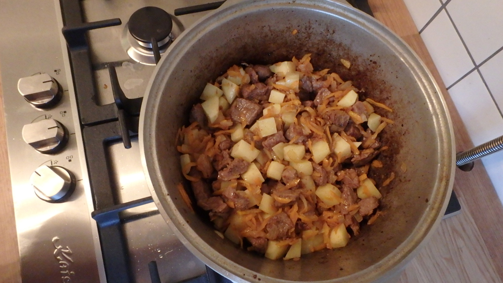 Лагман Решил порадовать себя и моих тёток лагманом.. Скептический взгляд не остановил. Итак возьни много. Решил готовить из говядины. Режем не крупно, кубиками. Теперь режем по очереди лук, трём морковку на крупной тёрке, картошку и красный сладкий перец. Несколько помидоров (мясистых) тру на крупной тёрке без кожицы. Туда ж резаный чеснок... Отдельно порезал на окончательную добавку дольки помидоров и перцев. Готовить начинаем с мяса, В разогретом казане обжариваем мясо до румяности и добавляем лук. До золотистого цвета. Потом морковку... Тушить, потом картошку... Опять тушить всё под крышкой. Потом перец... И после этого протёртые помидоры с чесноком. Потушив немного добавляем воду, чтоб на толщину пальца закрывало всё содержимое! Перемешиваем и добавляем соль и специи из секретного мешочка! (С узбечками в торговом центре надо дружить.) Томим всё на малом огне до готовности мяса. Картошку предпочитаю красную, чтоб не разваливалась. Лапшу покупаю специальную и не жалею. Варим лапшу по дотовности выкладываем в пиалу, а сверху заливаем гущей лагмана с бульоном и посыпаем сверху рубленой зеленью... Прошу к столу!