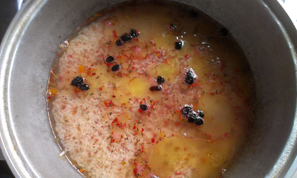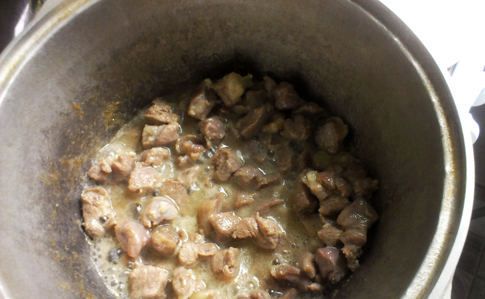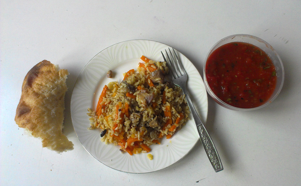 Плов Очень давно хотел плова! Казан остался зарыт на балконе. Залез, накопал блёсен для "Прошлого века" и казанчик. Готовить решил по стандартному рецепту... Итак - купил баранью лопатку - парную. Разогрел масло и его туда! 10-15 минут обжарки и лучёк, тоже туда! Лучёк - до золотистого цвета. Теперь туда ж морковку! Газ убираем и немного тушу. Рис - подходящий для плова, замочил в горячей воде и посолил. Когда морковка протушится немного добавляем рис. Из риса сливаем воду и добавляем специи - там целый список - покупаю его у узбечки на Речном.. Зира, шафран, барбарис - куча там всего - отличная смесь! Фото с закладкой морковки забыл сделать... Всовываем в рис головку чеснока и доводим его до готовности! Когда всё готово, выключаем газ и накрываем казан полотенцами на минут 20... Потом приходят голодные близкие и жрут это с соусом с базиликом и конечно - лепёшкой... Очень мало осталось... Надо снова готовить...