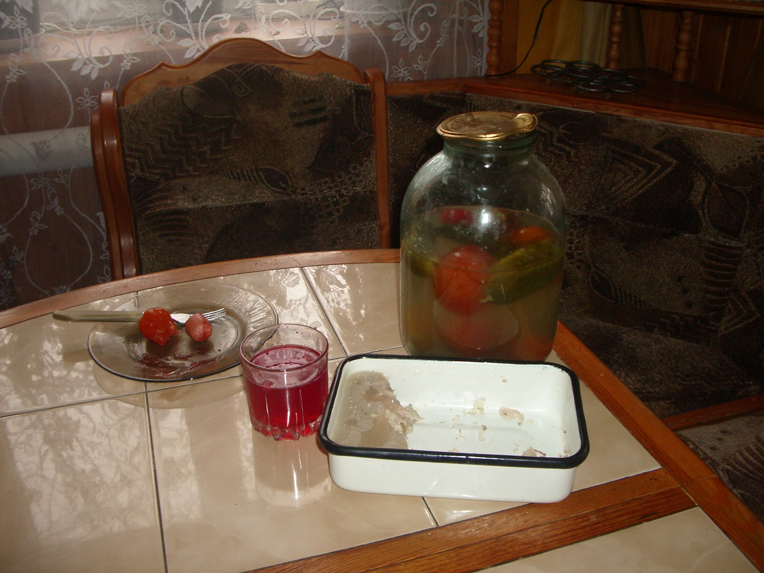 Не умею готовить Как сказал один человек "а пища у нас простая и здоровая". И действительно, все готовят, а я нет, но есть то хочется! Полазил по сусекам, нашел: половину цеплёнка, варёную картошку, кусок солонины, капусту соленую, солёные огурцы, два свежих помидора, лук репчатый (размером с ручную гранату), чеснок и полкило продукта (с того года осталось). И так: Солонину нарезал по голодному, толщиной 5мм, срезал сало и положил первым слоем на фольгу. Картошку на четыре части и на сало, плотненько. Сверху накрыл солониной и упаковал в фольгу. Салатик постный - помидорки огурчики, одну треть луковицы, соль, перец черный молотый и растительное масло чуть-чуть. Смешал, посмотрел- красота! Нет, не так, быстро слепил бутер (черный хлеб, солонина, хрен из банки покупной) отпробовал продукта, ещё отпробовал, закусил, ВОТ ТЕПЕРЬ КРАСОТА! Далее: Капуста плюс лук и растительное масло, попробовал- красота (см. выше, очерёдность таже). Повторил- здорово! Тепереча про курька: Внутрь чеснок, не мять!, заткнул солонинкой, под крылья по зубчику чеснока для равновесия, что бы не качало, перец, соль и в фольгу. И чтоб красиво, непремненно красиво должно быть! Два завернутых кулька на сковородку и в духовку, 180 градусов, а сам к салату, он сок дал, ну и конечно продукт не забывать! Минут чере 30 достал картошку, а ещё через 15 и курька. Ну вот собственно и всё, юзайте! PS Очерёдность блюд и объёмы продукта - строго индивидуально. Приятного аппетита!