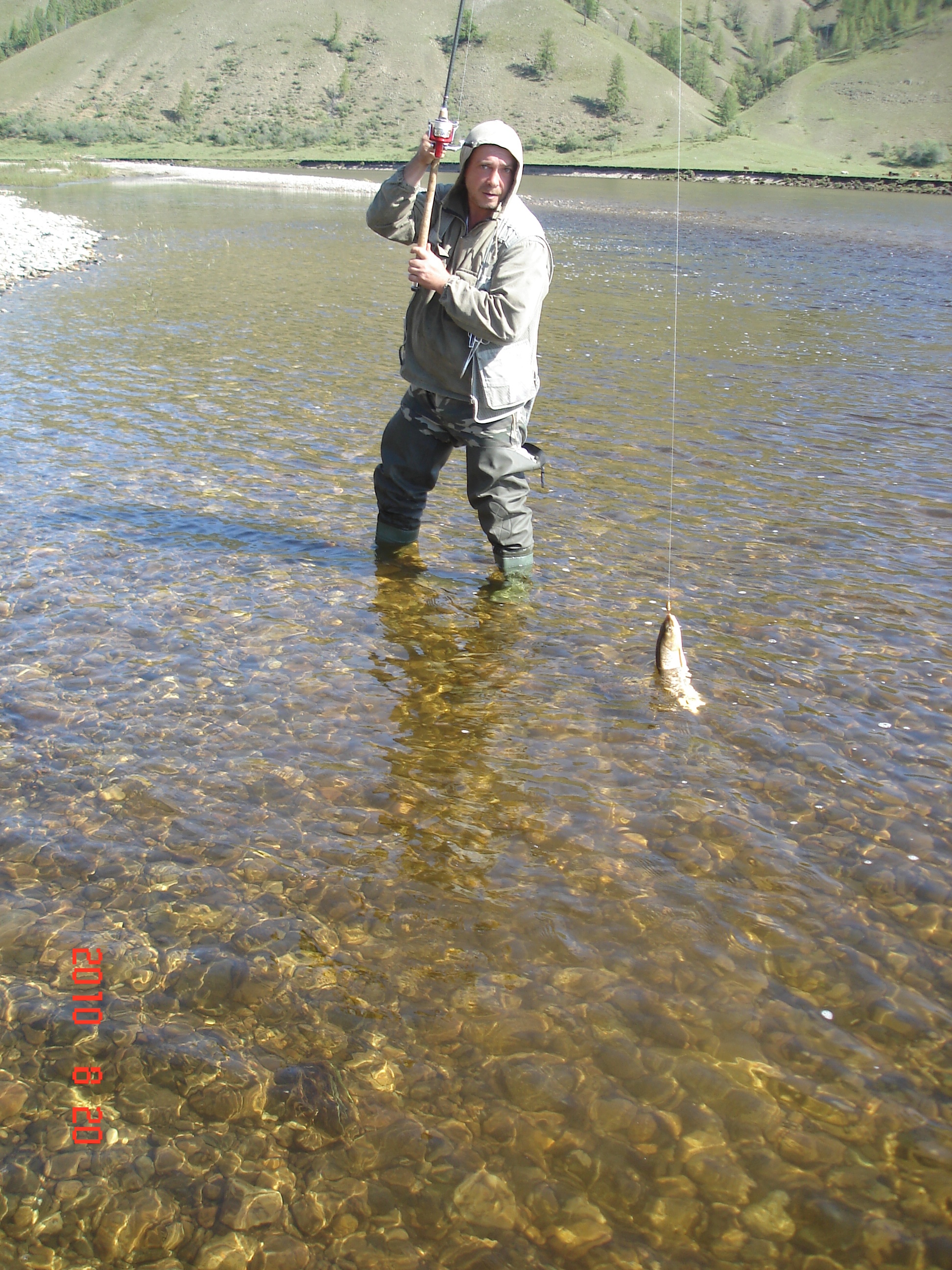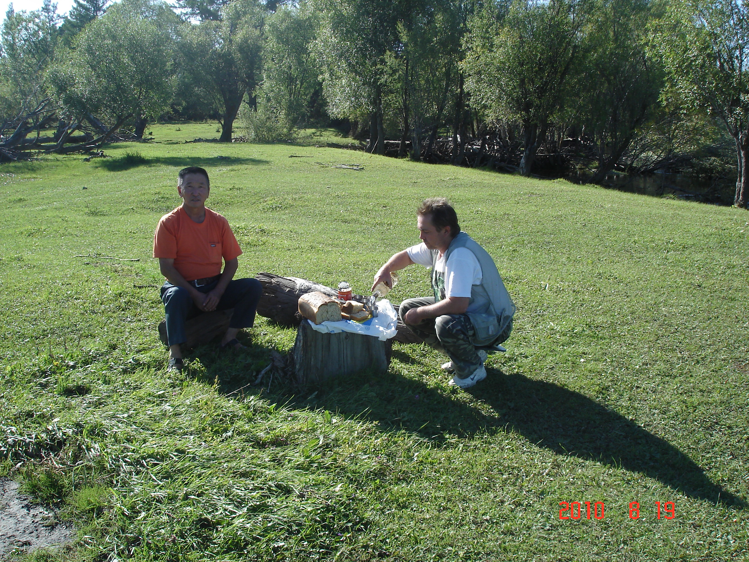 ПРОДОЛЖЕНИЕ 5. Приезжаем к цели нашего маршрута реке Орлиная. Планировали это сделать за два дня, а получилось за пять. Река Орлиная - это приграничная зона, поэтому необходимо наладить отношения с погранцами. Река Орлиная - это природо - охраняемая зона (таймень - в красной книге Монголии, лов по лицензии, поймал - отпусти), поэтому необходимо наладить отношения с природо-охранными службами. Нужны посредникии мало-мало говорящие по русски. Фото 1. Поляна накрыта. Налаживаем отношения. Монгльская водка "Ченгиз золотая" - очень хорошая водка. Фото 2. Конечный пункт нашего путешествия - река Орлиная. Фото 3. В гостях. Фото 4. Все для гостей. Хозяин дома исполняет песню на русско- монгольском диалекте: "Милый друг, милый друг: Как дела? Как дела? Сан бай ну, Сан бай ну". Фото 5, 6, 7, 8, 9. Первые ленки реки Орлиной. Фото 10. Миша со светлым хариусом (бывает черный). Фото 111, 12, 13, 14. Драйв. Фото 15, 16, 17. В этот день мы четвером поймали более восьмидесяти ленков и хариузов. Себе взяли на уху и засол. Остальных отпустили.
