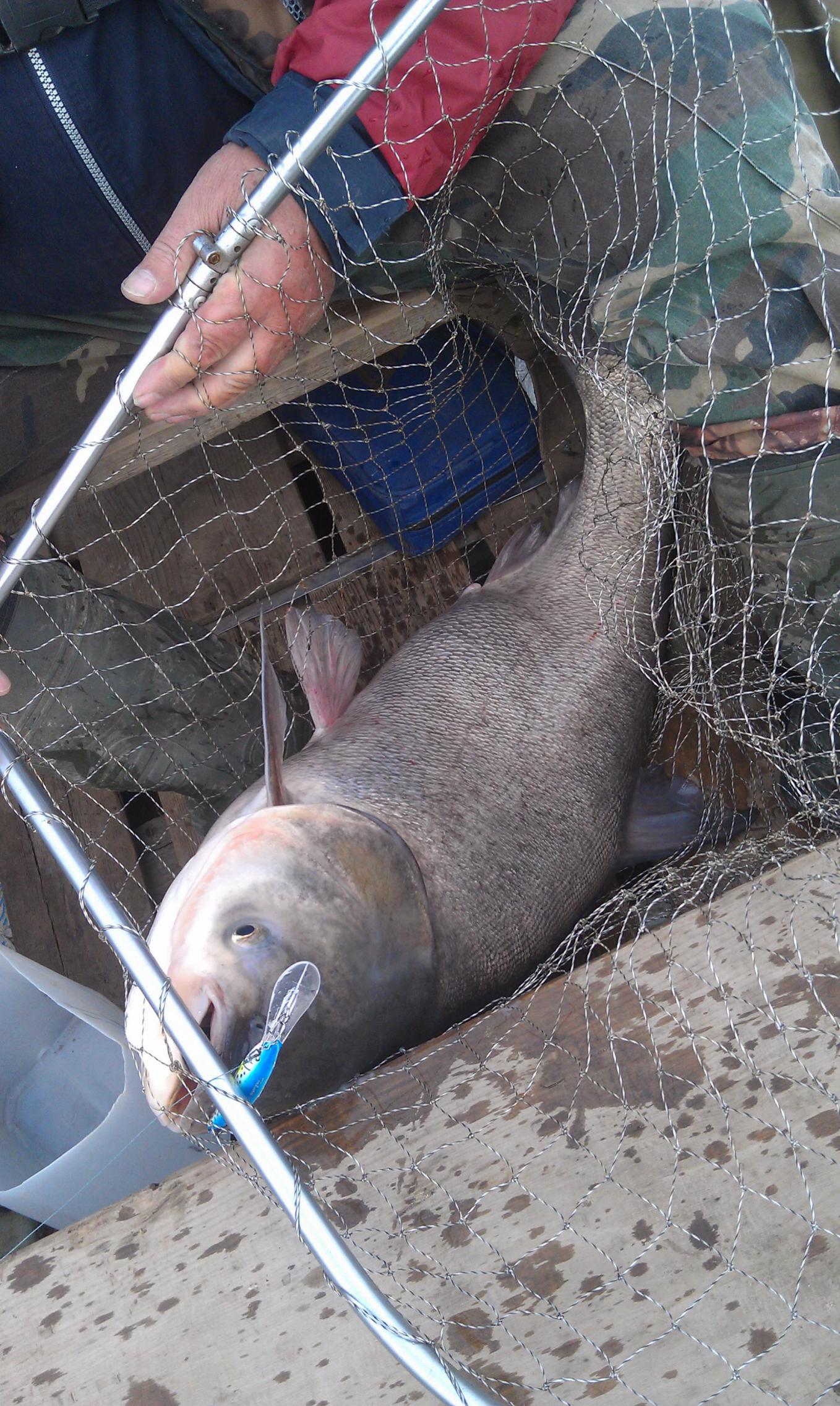 В первый день погода терпимая. Землянка. Первый проход и Гадалин тащит что-то серьезное. Дубовый спиннинг в дугу под лодку. Сопротивление недолгое и толстолобик на 12 800 кг. у меня в подсаке. Если и багранули, то за верхнюю губу надо было еще попасть. Все, дело пошло! Однако, остаток дня и последующие 4 дня полный абзац. Начался ветер. Гадалин ушел в эти дни на озеро напротив Землянки и удачно таскал окуней, красноперок и щучек за двуху. Я продолжал упорно бороздить Землянку там же, где делал это осенью и ошибся. Все это надо было делать ниже - от ямы и с проходами метров по 400.