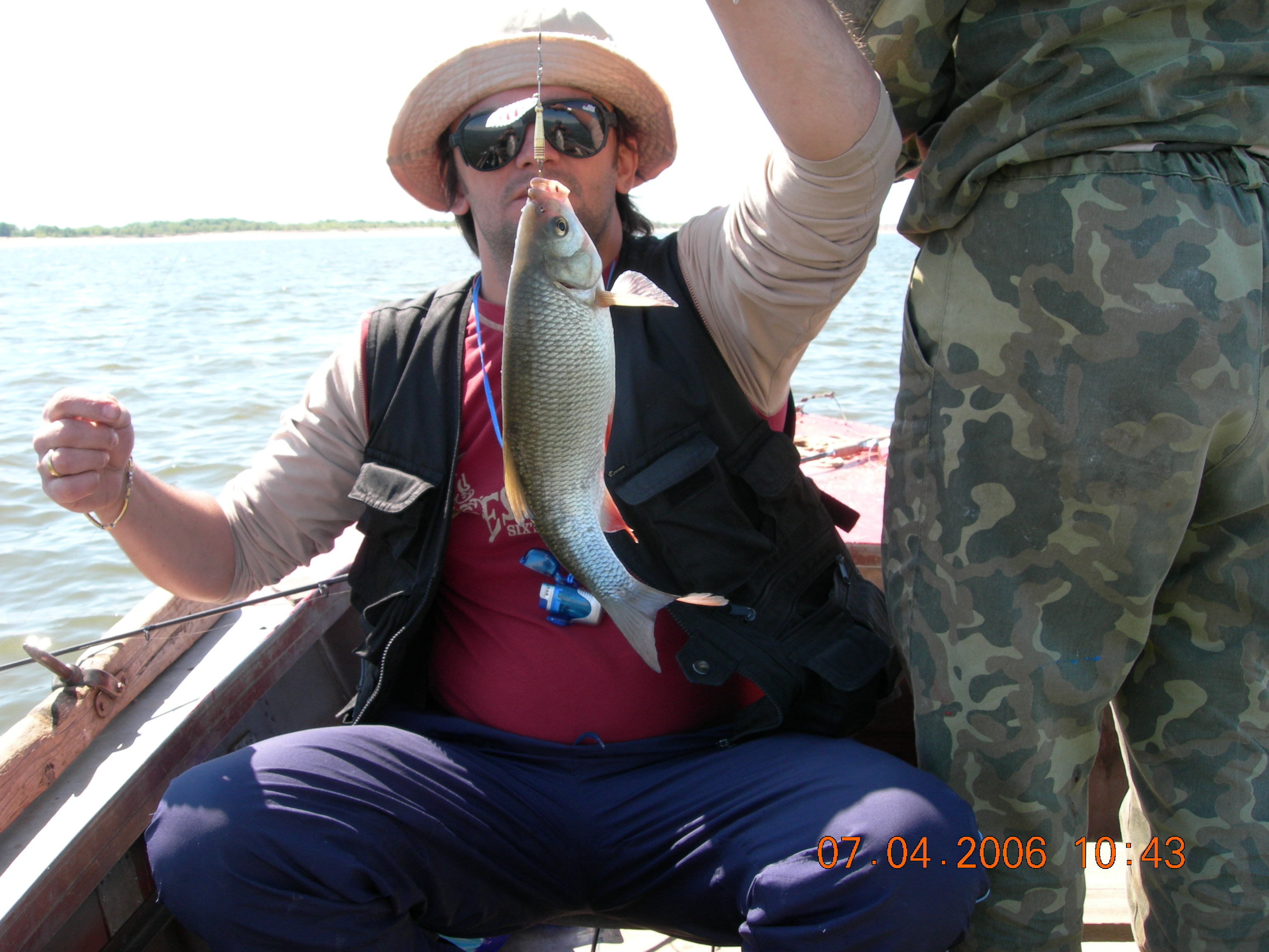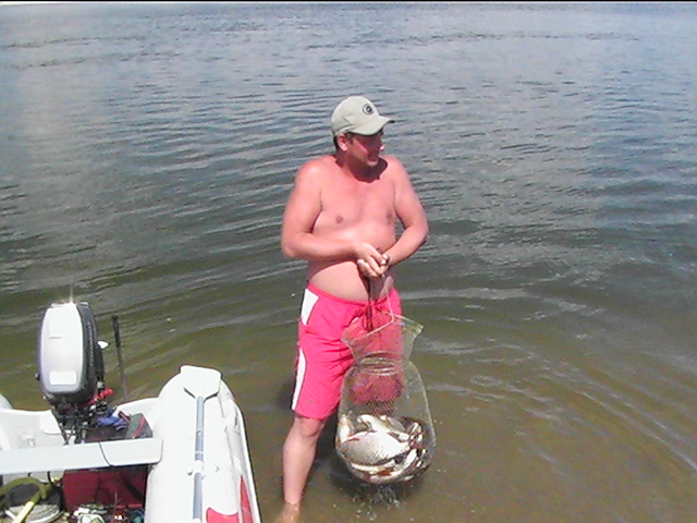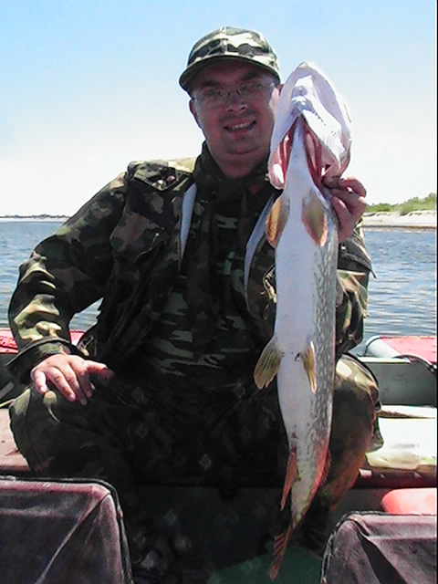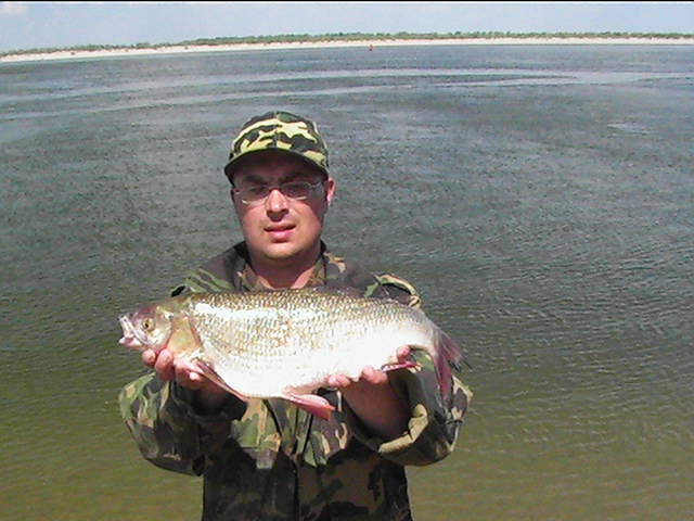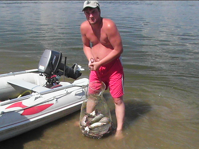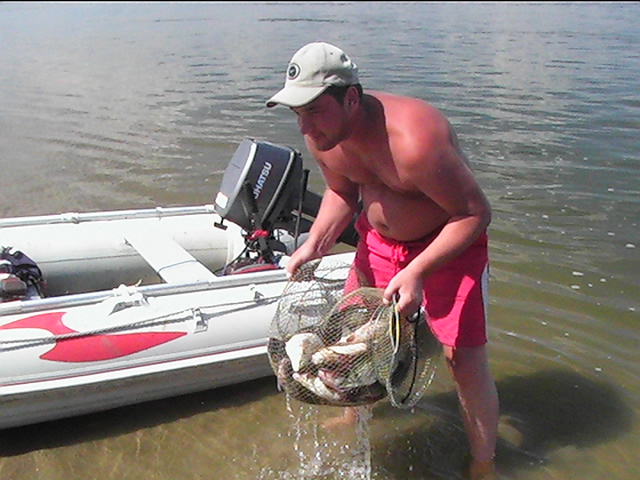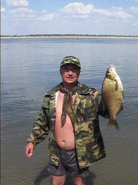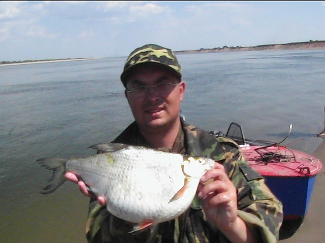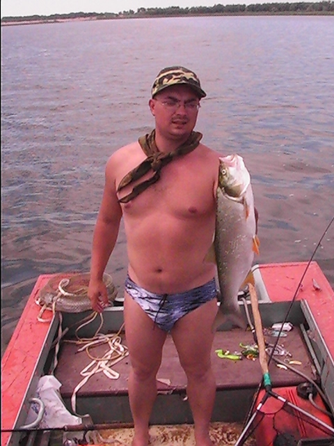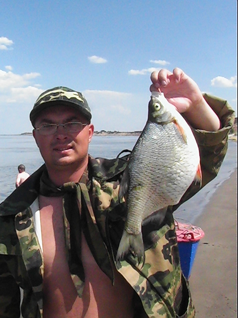 Неделька была местами ветренной особенно в начале недели, так что на обед приходилось возвращаться, медленно переваливаясь по волнам, с обильным бодрящем душем, и после обеда всматриваться на просторы, есть ли барашки или еще сидеть курить до вечера или до завтра. Клев был так же не устойчивым, то прорывало, натаскаешь, то купаешь блесны и джиги часами безрезультатно, ловиться все выходами и найденным местам надо давать отдыхать денек другой, иначе каждый следующий день становиться чуть ли не на порядок все хуже и хуже, если в первый раз натаскаешь тот же садок судака, уже не считая, ну штук 12-15, да еще на отпускаешь которых поменьше, то на следующий день там поймаешь штук 6-8, еще на следующий 2-3 шт, да и мелких будешь уже сомневаться отпускать ли, ведь полкило судачек тоже вроде не таким плохим начинает казаться, вот только когда такого на филе попробуешь разделывать вот тогда и начнешь жалеть, лучше б подрос еще. Да кстати пропала крупная щука, которую многие отпускали, сейчас на 3-ку поди поищи ее, у нас самая большая на 2,650 кг, мелкая по прежнему ловиться, но гораздо реже и большей частью в штанах на мелководьте рядом с травой. После Лехиных сазанов решили тоже прикормить местечко, где прощлым годом сазанов чуть ли не десятками таскали, с вечера набили сетки и опустили, с утра наполнили снова и за дело,вобщем убили пол дня, мешок перловки, мешок глины синий, жмыха бойлов туда и т.д. и пусто, у Мишки Кубарева одна поклевка похожая на сазанью и все, а пробовали и на бойлы и на ракушек простых и жареных на масле с коноплей и жмых, лес донок и с лодок и с берега и ничего... Поехали вечером в другое место и тоже пролет, до кучи лягушку тоже закидывали, но не повезло. Мишка еще одно утро убил на это дело без поклевок и успокоился. Сазан есть, но нет концентрираванного в одной точке, ходит по мелководью одиночный, а так что бы выворачиваться на одном месте такого нет. У меня он похоже пару раз брался на вертушку в штанах, говорят может большой морской сазан или толстолобик, фрикцион с огромной скоростью резко завизжал и через несколько секунд плетенка лопнула, ну как пуля просто схватил и как дал вдаль, после этого тут же расслабил фрикцион, сомовий поводок повесил 50 см тросик и через пол часа похоже таже штука, хватает аглию №6 и секунд 20 фрикцион сбрасывает мгновенно порядка 30-40 метров плетенки, пытаюсь затянуть фрикцион, он же только начинает набирать больше скорость, впечатление такое, что зацепил уходящий поезд, и остановить или притормозить его хоть чуть чуть, настолько не реально, что стоишь и тупо смотришь как кончается плетенка, крепко уперевшись ногами и держа согнутый спиннинг в недоумении, вобщем надо ловить там где этих штук нет или меньше, либо иметь специальные снасти и лески, плетенка 0,25 которую зацепившись за корягу не разорвешь, иной раз отрезать приходиться, рвется оказывается этой штукой с разбегу в считанные секунды. Все это было при ловле язя, который как и вся рыба на этой неделе ловился выходами, т.е. по всплескам или место знаешь где он должен точно ходить, сидишь и ждешь, когда небольшая стайка будет прошодить мимо из который успеваешь выдернуть несколько штук, остальное время багрится крупная густера до кило и чуть поболее, ну и конечно лещ. Лещ вообще стаями плавится поверху как на мелководье, так и на большой воде даже не стаями, 