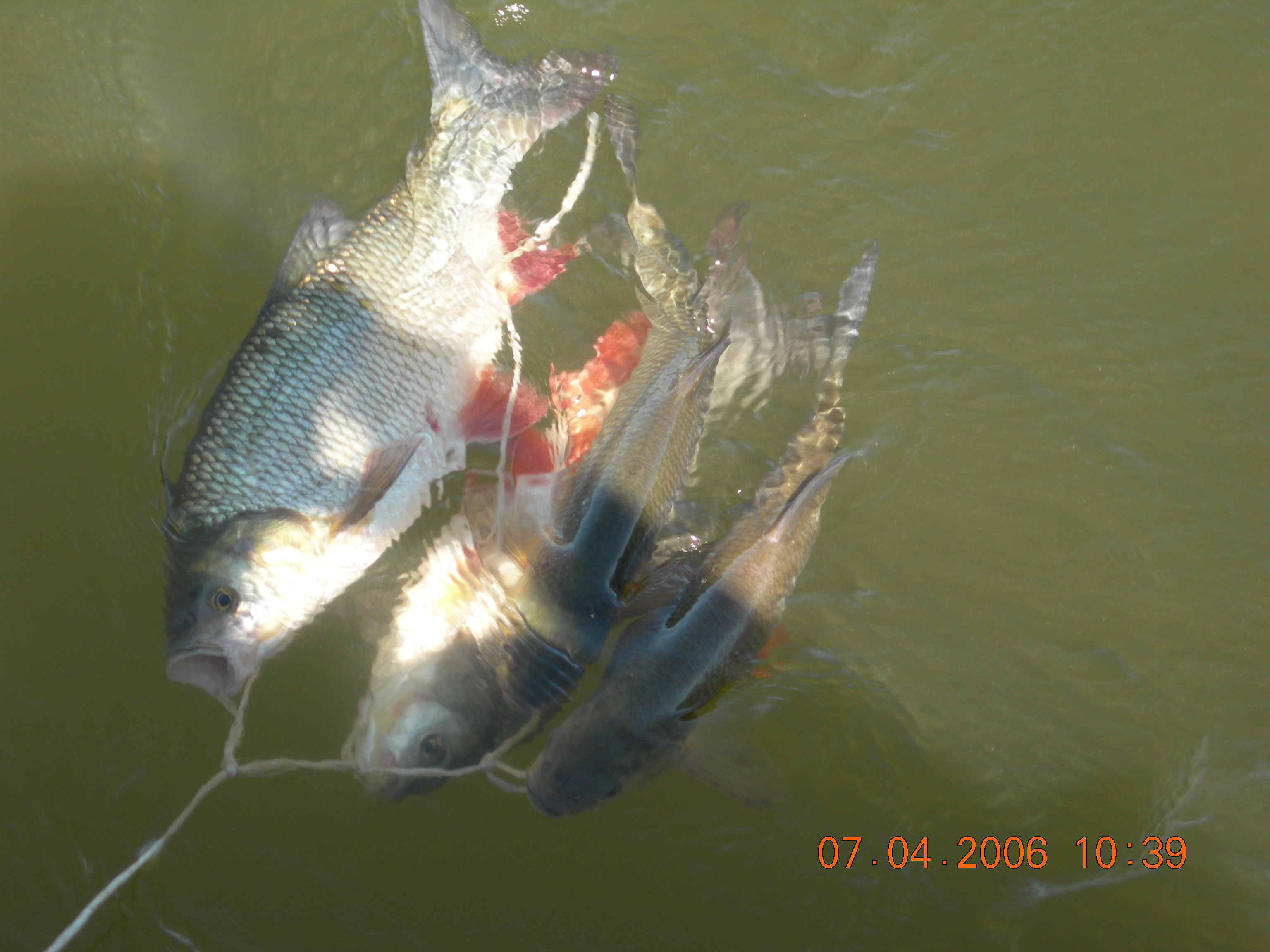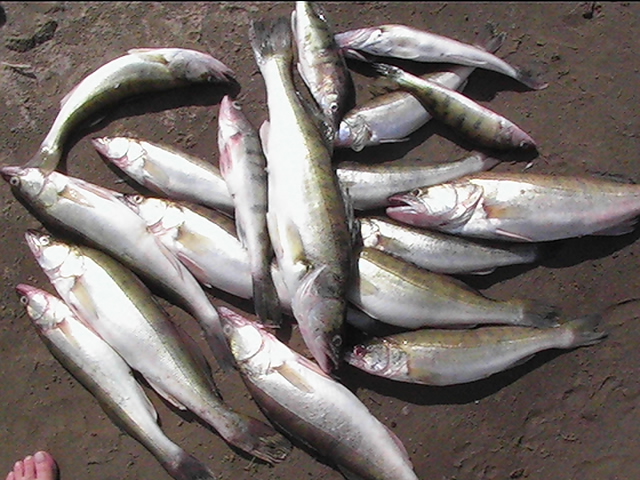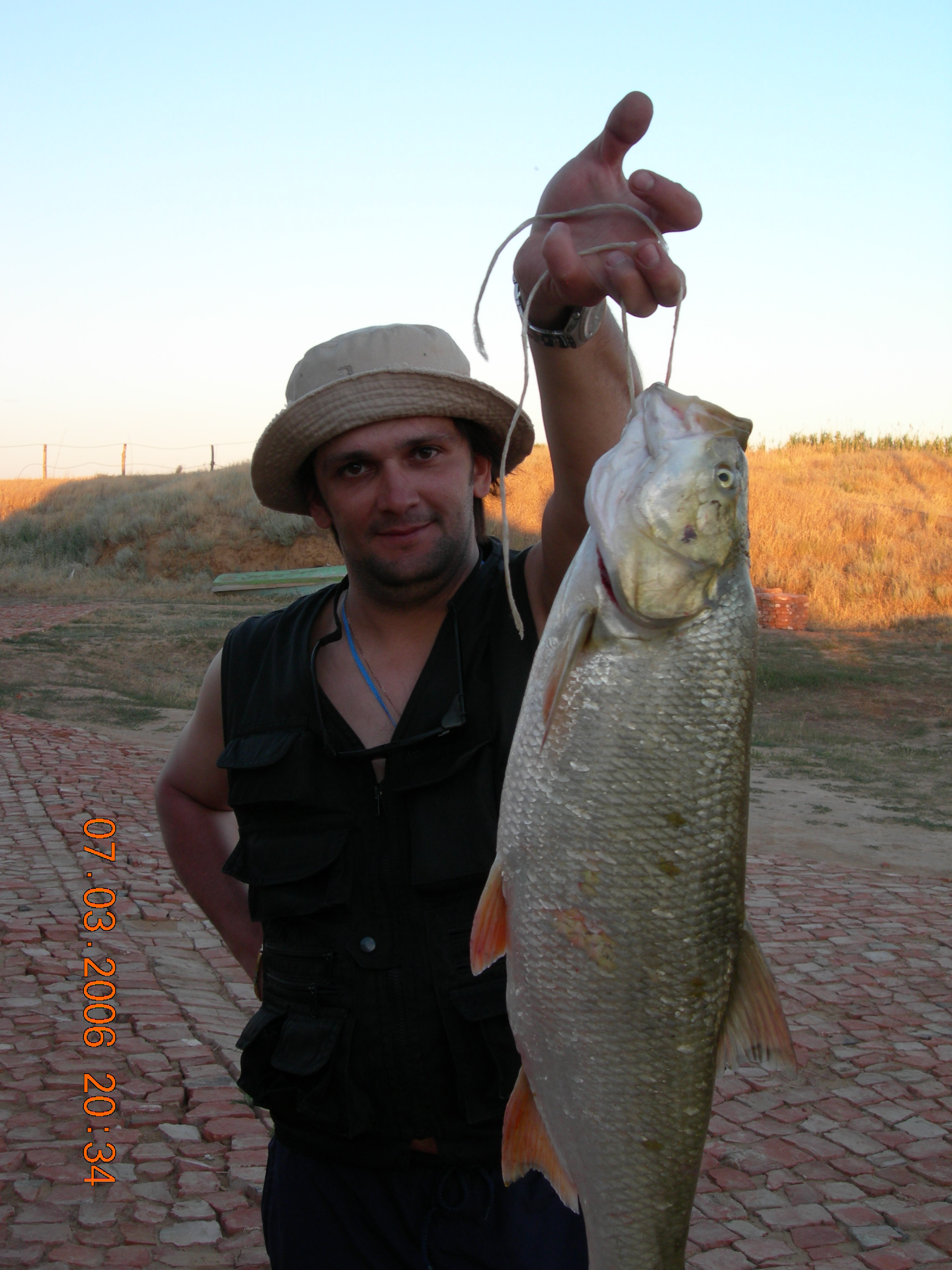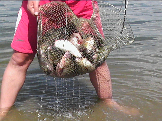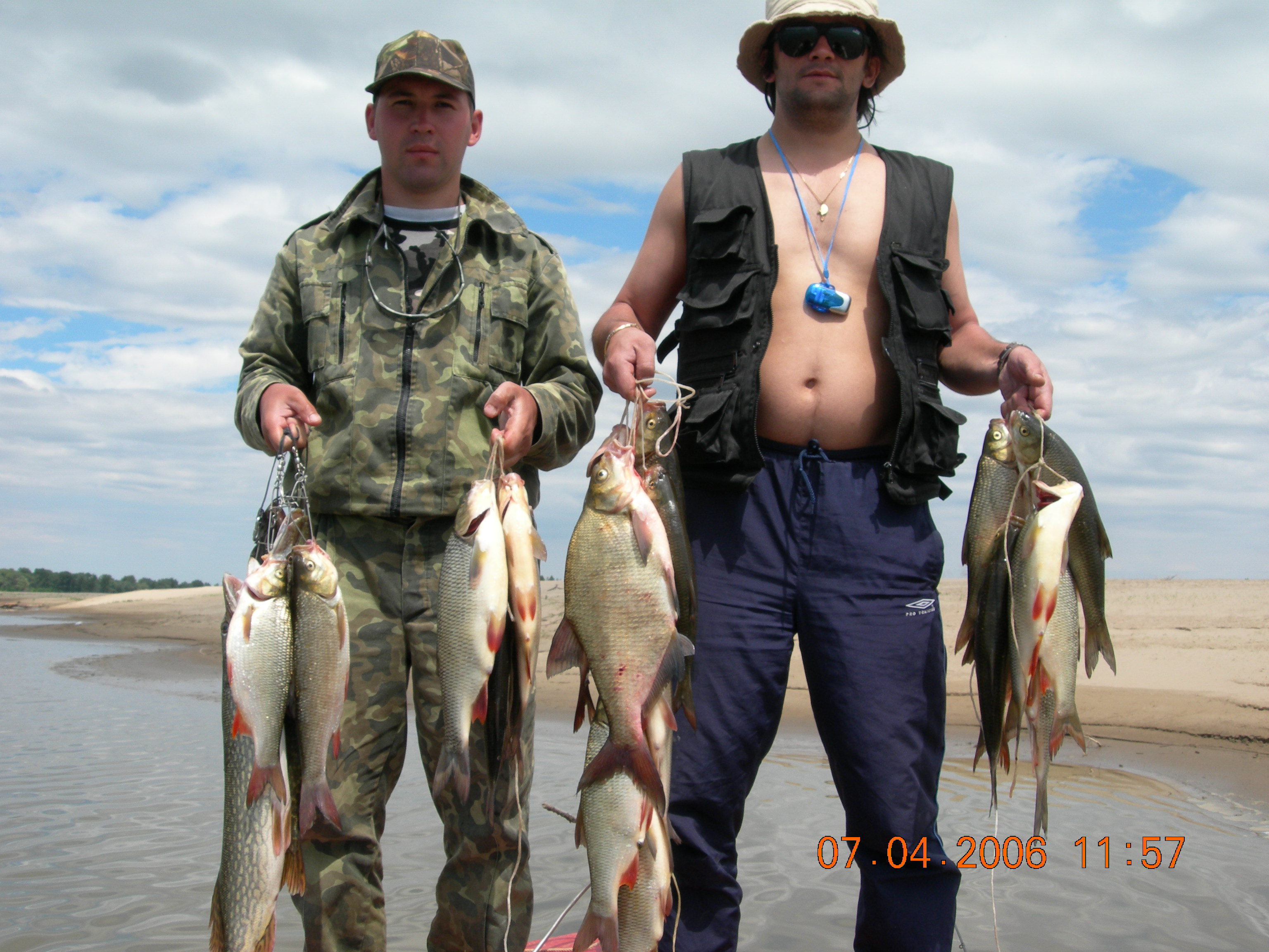 Неделька была местами ветренной особенно в начале недели, так что на обед приходилось возвращаться, медленно переваливаясь по волнам, с обильным бодрящем душем, и после обеда всматриваться на просторы, есть ли барашки или еще сидеть курить до вечера или до завтра. Клев был так же не устойчивым, то прорывало, натаскаешь, то купаешь блесны и джиги часами безрезультатно, ловиться все выходами и найденным местам надо давать отдыхать денек другой, иначе каждый следующий день становиться чуть ли не на порядок все хуже и хуже, если в первый раз натаскаешь тот же садок судака, уже не считая, ну штук 12-15, да еще на отпускаешь которых поменьше, то на следующий день там поймаешь штук 6-8, еще на следующий 2-3 шт, да и мелких будешь уже сомневаться отпускать ли, ведь полкило судачек тоже вроде не таким плохим начинает казаться, вот только когда такого на филе попробуешь разделывать вот тогда и начнешь жалеть, лучше б подрос еще. Да кстати пропала крупная щука, которую многие отпускали, сейчас на 3-ку поди поищи ее, у нас самая большая на 2,650 кг, мелкая по прежнему ловиться, но гораздо реже и большей частью в штанах на мелководьте рядом с травой. После Лехиных сазанов решили тоже прикормить местечко, где прощлым годом сазанов чуть ли не десятками таскали, с вечера набили сетки и опустили, с утра наполнили снова и за дело,вобщем убили пол дня, мешок перловки, мешок глины синий, жмыха бойлов туда и т.д. и пусто, у Мишки Кубарева одна поклевка похожая на сазанью и все, а пробовали и на бойлы и на ракушек простых и жареных на масле с коноплей и жмых, лес донок и с лодок и с берега и ничего... Поехали вечером в другое место и тоже пролет, до кучи лягушку тоже закидывали, но не повезло. Мишка еще одно утро убил на это дело без поклевок и успокоился. Сазан есть, но нет концентрираванного в одной точке, ходит по мелководью одиночный, а так что бы выворачиваться на одном месте такого нет. У меня он похоже пару раз брался на вертушку в штанах, говорят может большой морской сазан или толстолобик, фрикцион с огромной скоростью резко завизжал и через несколько секунд плетенка лопнула, ну как пуля просто схватил и как дал вдаль, после этого тут же расслабил фрикцион, сомовий поводок повесил 50 см тросик и через пол часа похоже таже штука, хватает аглию №6 и секунд 20 фрикцион сбрасывает мгновенно порядка 30-40 метров плетенки, пытаюсь затянуть фрикцион, он же только начинает набирать больше скорость, впечатление такое, что зацепил уходящий поезд, и остановить или притормозить его хоть чуть чуть, настолько не реально, что стоишь и тупо смотришь как кончается плетенка, крепко уперевшись ногами и держа согнутый спиннинг в недоумении, вобщем надо ловить там где этих штук нет или меньше, либо иметь специальные снасти и лески, плетенка 0,25 которую зацепившись за корягу не разорвешь, иной раз отрезать приходиться, рвется оказывается этой штукой с разбегу в считанные секунды. Все это было при ловле язя, который как и вся рыба на этой неделе ловился выходами, т.е. по всплескам или место знаешь где он должен точно ходить, сидишь и ждешь, когда небольшая стайка будет прошодить мимо из который успеваешь выдернуть несколько штук, остальное время багрится крупная густера до кило и чуть поболее, ну и конечно лещ. Лещ вообще стаями плавится поверху как на мелководье, так и на большой воде даже не стаями, 