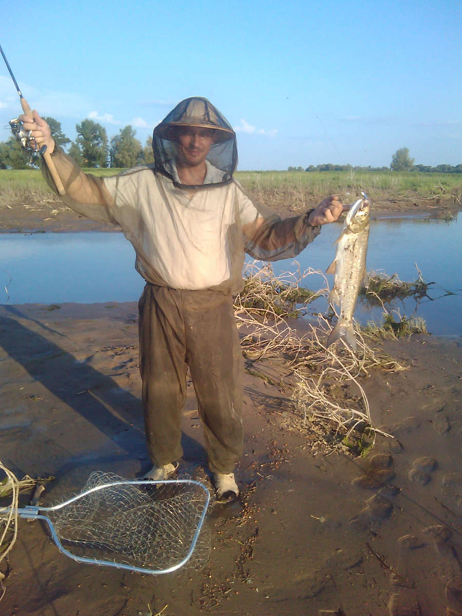 На пятый день пребывания в Никольском (11 июня) нам с Кирюхой действительно показалось, что мошки просто "ж..па" сколько. Мы поняли для себя: мы не любим мошку совсем! ))) Хотя, сейчас уже кажется, что можно и приспособится. Андрей (Егерь), например, никаких костюмов москитныйх не одевает, - ванилином с кремом мажет открытые места и все, да рубашка с брюками плотные. Ванилин реально спасает, только руки и лицо желтые на пятый день становятся. Другой местный мужик накрывался сеткой пропитанной гвоздичным маслом и тоже - ничего. В следующем году обязательно поеду еще раз, но на подольше, с правильным настроем и баночками, и когда вода пониже будет. А то - ни одной щучей поклевки не видели у бородков. Лес залит водой - вся щука там, говорят. Немного фото про мошку и не только. Туда и обратно (но уже со спецподготовкой) Рыба и мошка, собственно. Кирюха с жерешком на яру в Козинке. Я в Борисовке, тоже на яру. ))) Купание "красного коня" напротив бородка в Борисовке. Очень помогает, иначе - сварились бы. Щука! (с палец)