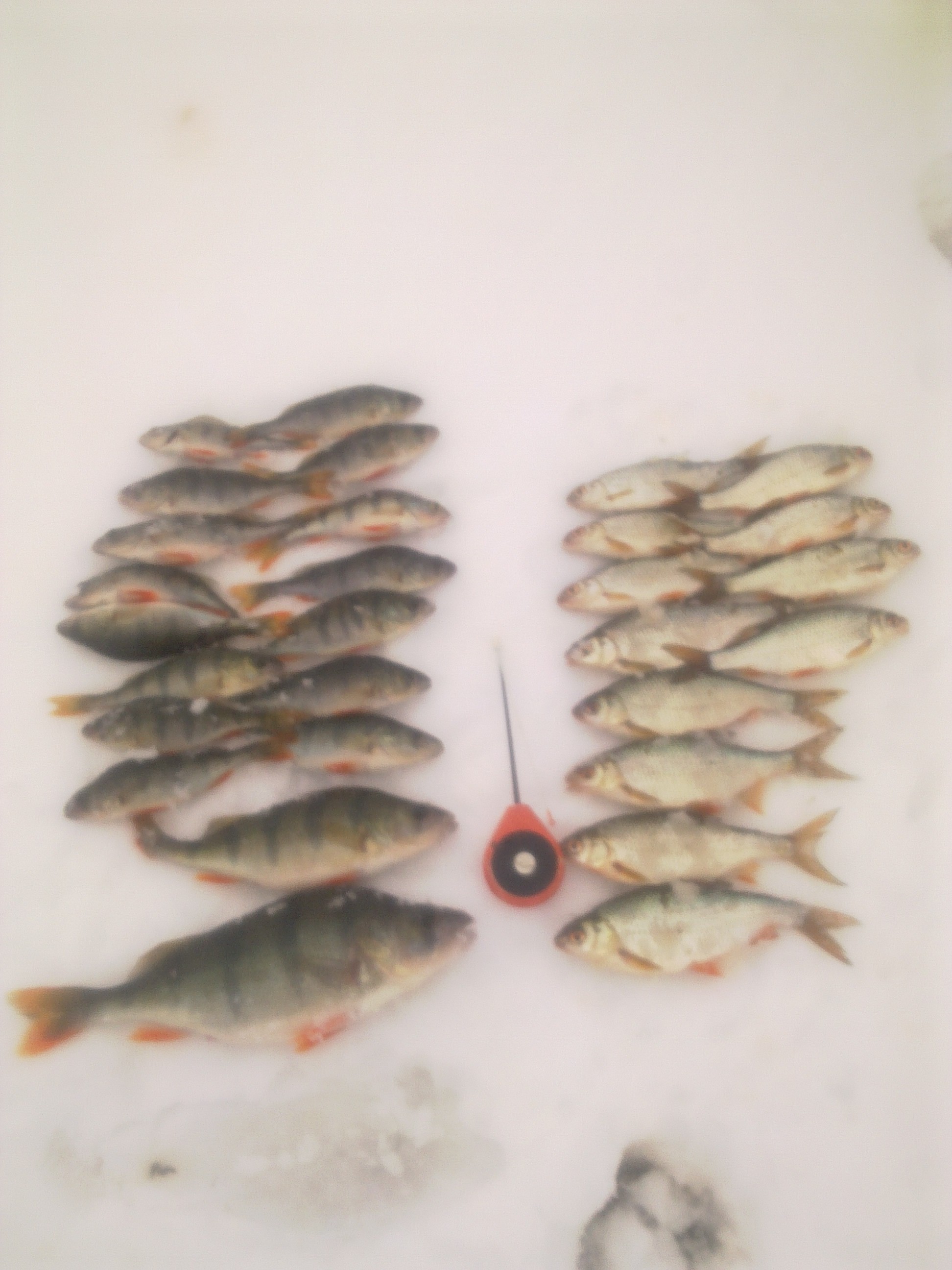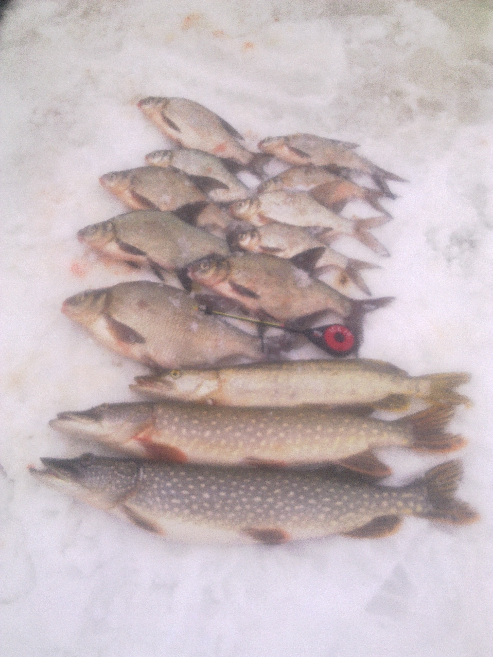 Зимняя рыбалка при летней погоде это просто кайф. СОлнышко греет ,птицы заливаются , бабочки летают а ты сидиш на льду и смотриш на поплавок в лунке. По рыбке как обычно подлещик, плотва , окунь и маленькая щучка , всего взяли кил 5-6 не взвешивали.