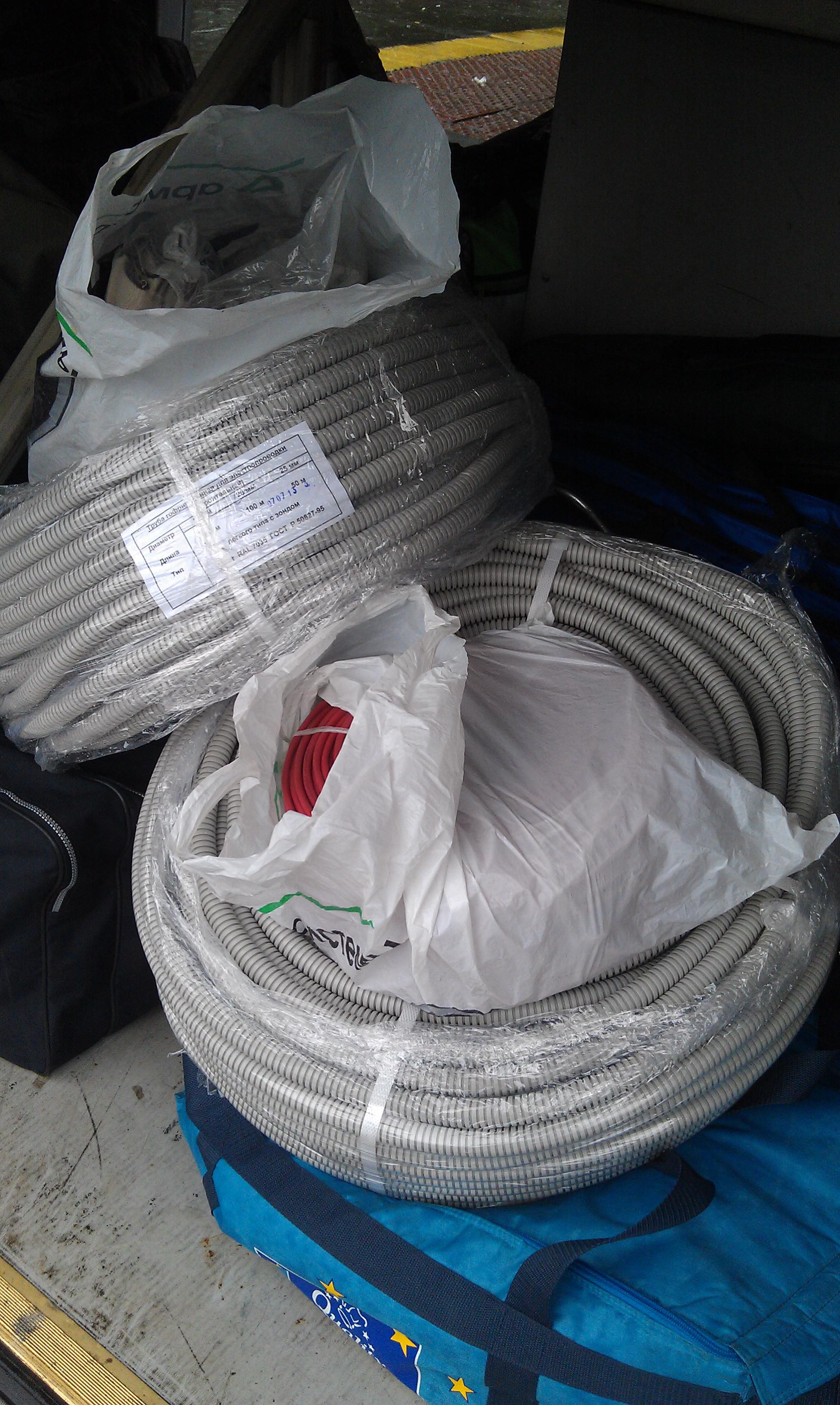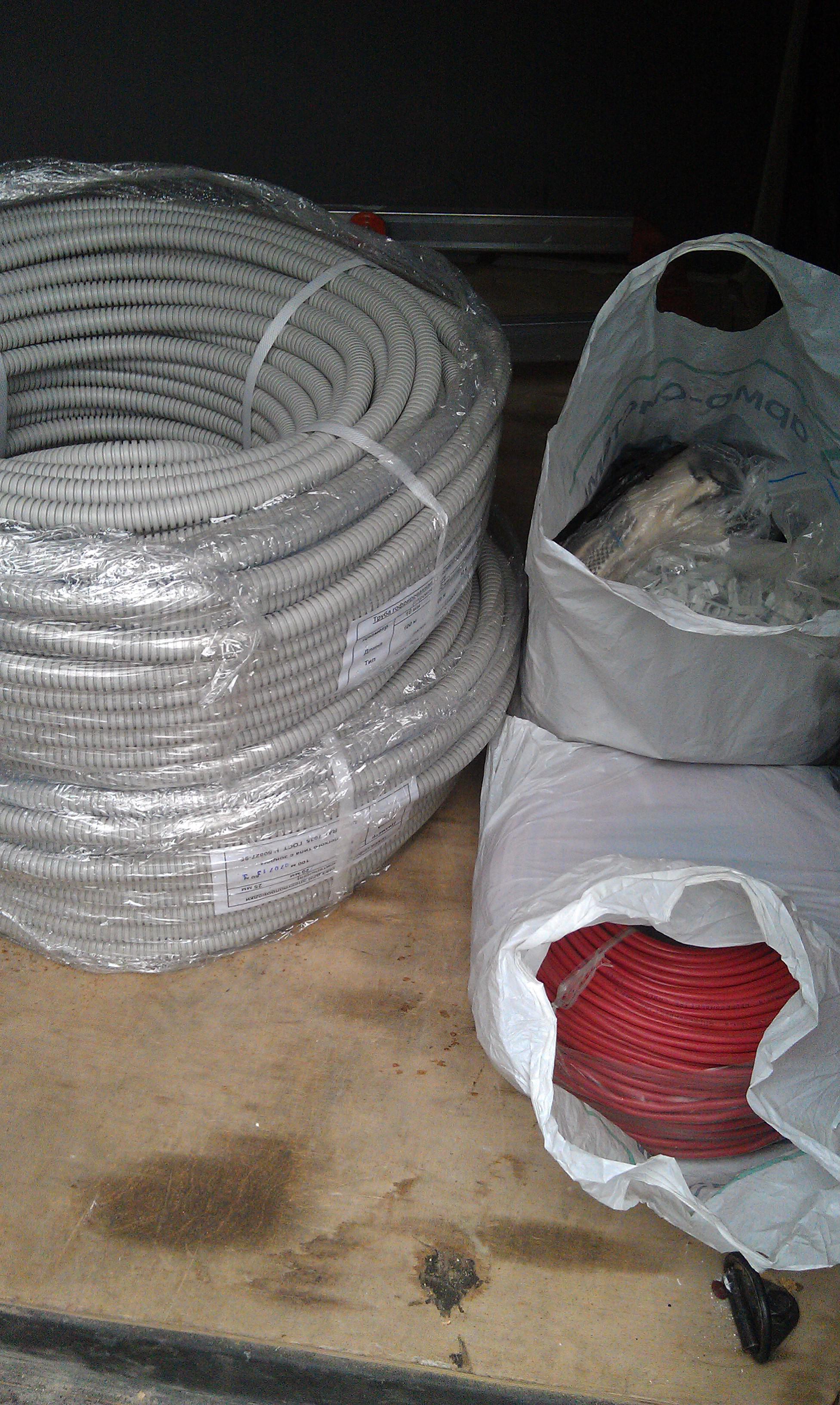 Это для Вадима. С левой стороны автобуса 2 пакета с надписью "АРМО-СИСТЕМЫ" и 2 бухты гофры. Кабель (красный) не горючий, для разводки освещения.
