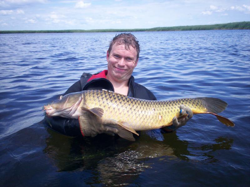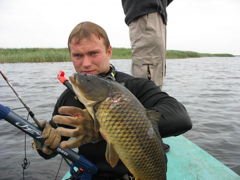 Отчёт от Лёхи Коршунова. Попробую рассказать ту же историю со своим видением (подводным), в этом деле я полный новичок, не считая нескольких попыток подводной охоты в Шатрище на Оке в 90 км от г.Рязань, .. Итак День первый: Ну наконец-то работа осталась где-то в 700 км за спиной в «солнечном» городе, так называемой Северной столице. Хотя нет…московская трубка разрывается от звонков Генерального ( он взял все бразды правления на себя.. теперь не знает что с ними делать…хренасдва я отвечу…нет меня…в отпуске..ура!!!!!) В 15.00 заехал за Колумбийцем в Солнцево и вперед…дорога 1600 км впереди, романтика. Обещал Алексею догнать автобус, что в НЯ, забрать документы..договорились с водилой сразу за МКАД, но там стоял ГАЙец и автобус прошел ходом от греха подальше, телефон разрывался в машине от звонков водилы, но мы-то на улице! Минут через 30 почувствовав неладное, прояснили сей факт и двинули в догонку..Догнал км через 80!! Автобус шел в левом ряду работая как поршень, еще километров 20 пытался обогнать, но куда-там..справа полные тормоза, а автобус не перепрыгнуть..ладно обогнал оттормозил, забрал документы, главное поздоровался!!! Пол автобуса знакомых и дорогих сердцу лиц Свернул с М4 на М6 Волгоград где-то 100 км от МКАД..звонок..Алексей пожелал ни гвоздя ни жезла..5 минут и вот он жезл…откупился…10 минут снова, на этот раз забрали права. Дорога одна полоса в каждую сторону, асфальт свежий без разметки, знаки обгон запрещен такие незаметные, когда едем на рыбалку!!! То подъем, то спуск, а камаз с разъе…й поршневой мчит 20 км/ч и полуторакилометровая пробка едва поспевает за ним..Ну скажите..я что похож на м…кА, способного ехать 1600 верст со скоростью 20 км/ч, да х.р с этими правами, пусть подавятся, зато дальше все их попытки были просто жалки..типа дай хоть сколько нибудь…Короче пытался быстрей получилось дороже и медленней..снова догнал автобус, снова родные лица, настроение поднялось, у родных лиц тоже ваще поднялось, еле на ногах стоят..А дальше просто дорога, просто романтика, 1 час сна и мы в Лазури, правда в НЯ в 7 утра заглянули таки..ну как же родных-то не повидать.. но это уже День второй: В 13.00 были на базе Лазурь, нас ждали. Покормили обедом (суп из белуги!!!! Да вы что с ума сошли-зажремся ж ) и…предложили дождаться Викторыча и вечером обсудить наши завтрашние действия. Точно с ума сошли..столько сил, труда чтобы оказаться в этих райских местах и потерять день? ДА НИКОГДА! Маску, трубку, ласты и в канал, что рядом с базой (через него и выезжают на Мечетный проран) жабры обсохли..вода чистая, прозрак метра 2, куча рыбы, красноперка, плотва, окуни, щучки… все мелкие, но их столько, наверное в тысячу раз больше чем в Оке, они загораживают обзор в маску, лезут в плавки, хватаются за каждый волосок на теле, стоит лишь замереть..но они не трофеи и все тут. Вдруг слышу какое-то зуденье, поднимаю из воды голову… и мать-мать ..вижу Байду-ударение на а (браконьерский катер в несколько раз больше прогресса, а на глиссере и в три раза выше, оснащенный парой моторов сил так по 200 каждый) несущийся вдалеке на скорости под сотню.. пара секунд и он уже рядом..едва успеваю прижаться к камышам. Да.. надо быть аккуратней, одна секунда и ты фарш! Бегу на кухню..дайте лодку с егерем..нет бензина?..да хоть с мотоциклов сливайте, но дайте лодку! Через 30 минут мы с Колумбийцем и егерем плывем по каналу, еще 10 мину
