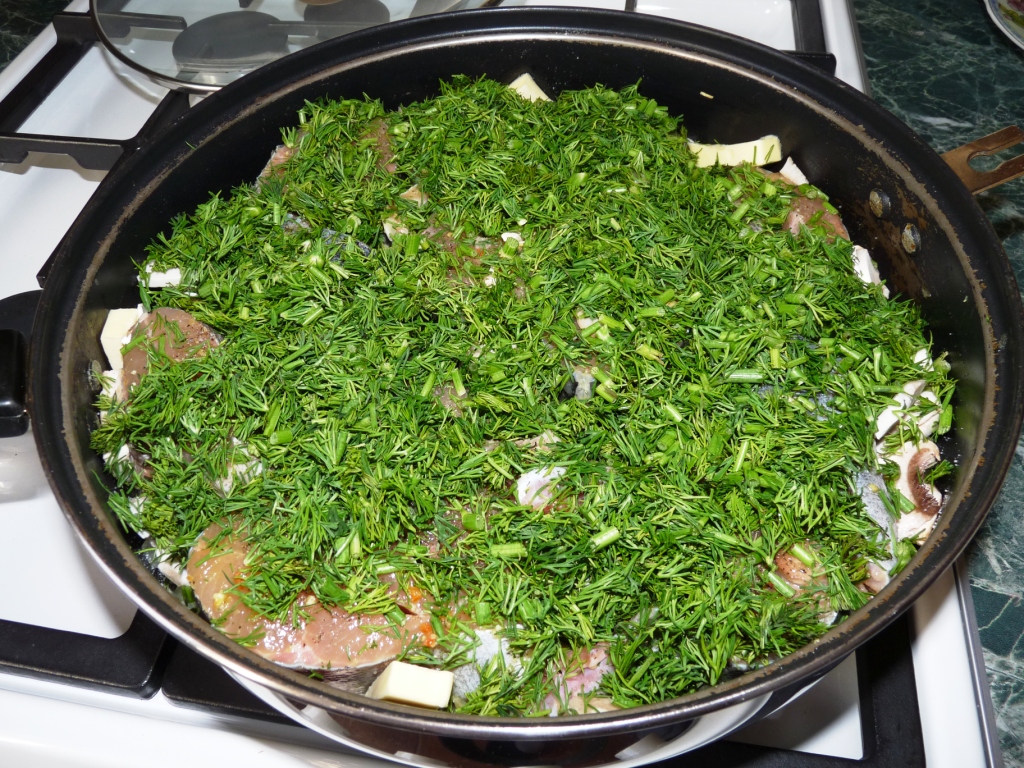 Форель в сливках. Рецепт этот не новый и периодически встречается на страницах Интернета, но приготовить форель именно этим способом как-то не доходили руки. И вот сегодня решился, тем более есть под рукой накануне пойманная форель! Это один из немногих рецептов приготовления форели, в котором не присутствует лимон (ещё один плюс за этот рецепт). Итак: всё очень просто, форель, лук, укроп, сливки. Вот основные ингредиенты этого блюда, но я добавил ещё немного чеснока (2 зубчика) и шампиньонов (300 гр)! В глубокой сковороде на сливочном масле недолго пассируем лук (2-3 головки), на слой лука выкладываем грибы, далее слой рыбы ( форель, промытую и порезанную порционными кусочками я минут на 20 замариновал в приправе «Вегета»), чеснок, затем слой укропа. Всё заливаем сливками (300 гр). Накрываем крышкой и тушим на медленном огне 25 минут! Блюдо готово! Ребята, это вкусно!