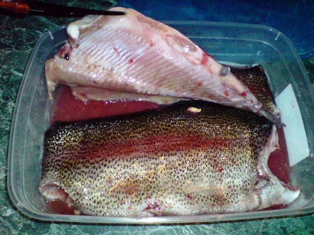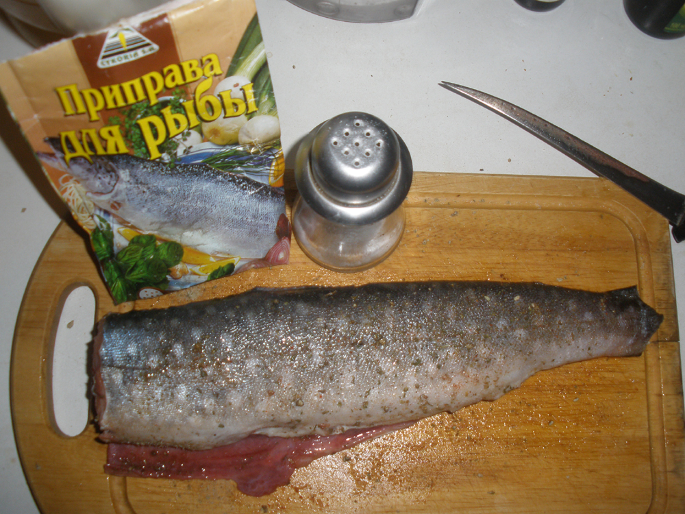 Кунджа запечёная... Именно кунджа, а не кумжа.. Хотите узнать разницу поройтесь в интенете... Короче - досталась мне кунджа - около килошника. Где взял - не скажу - Маляй удушит... А рыба очень красивая! Времени было не очень много и поэтому решил запечь в фольге. Почистил, обезглавил, выпотрошил. Натёр специями, в фольгу и на противень! После 30 минут, вскрыл фольгу и ещё 10 мин при 200 градусах. В горячем виде очень вкусно, в холодном суховата - мясо очень плотное. Приятного аппетита!