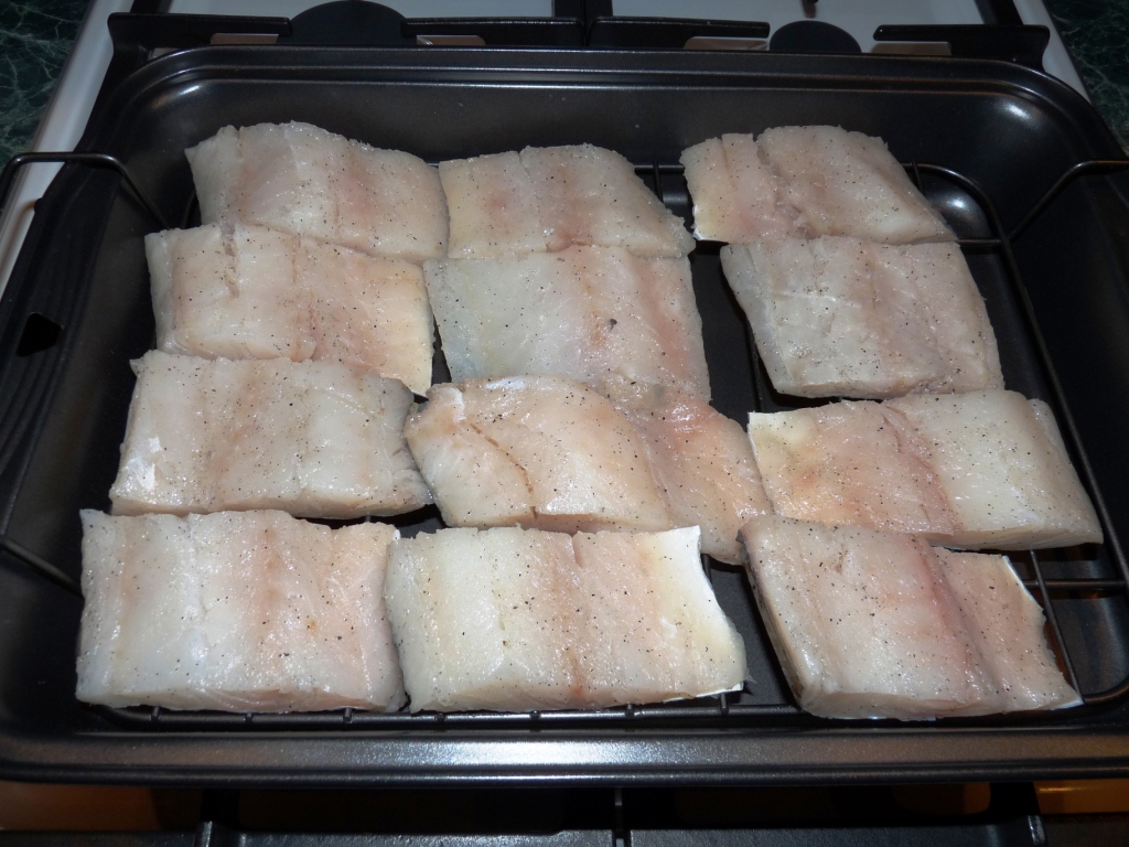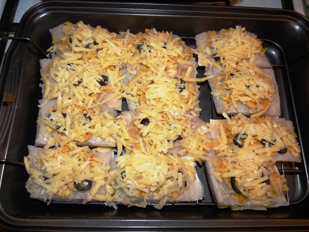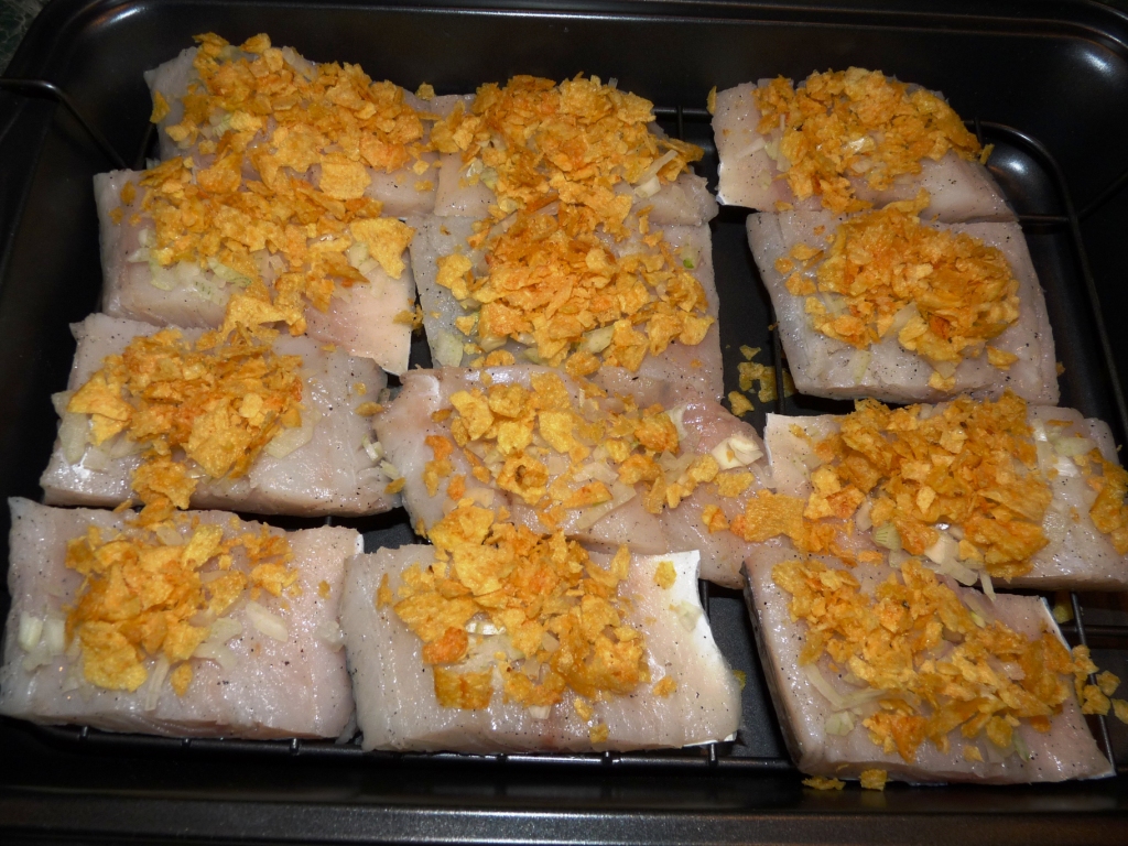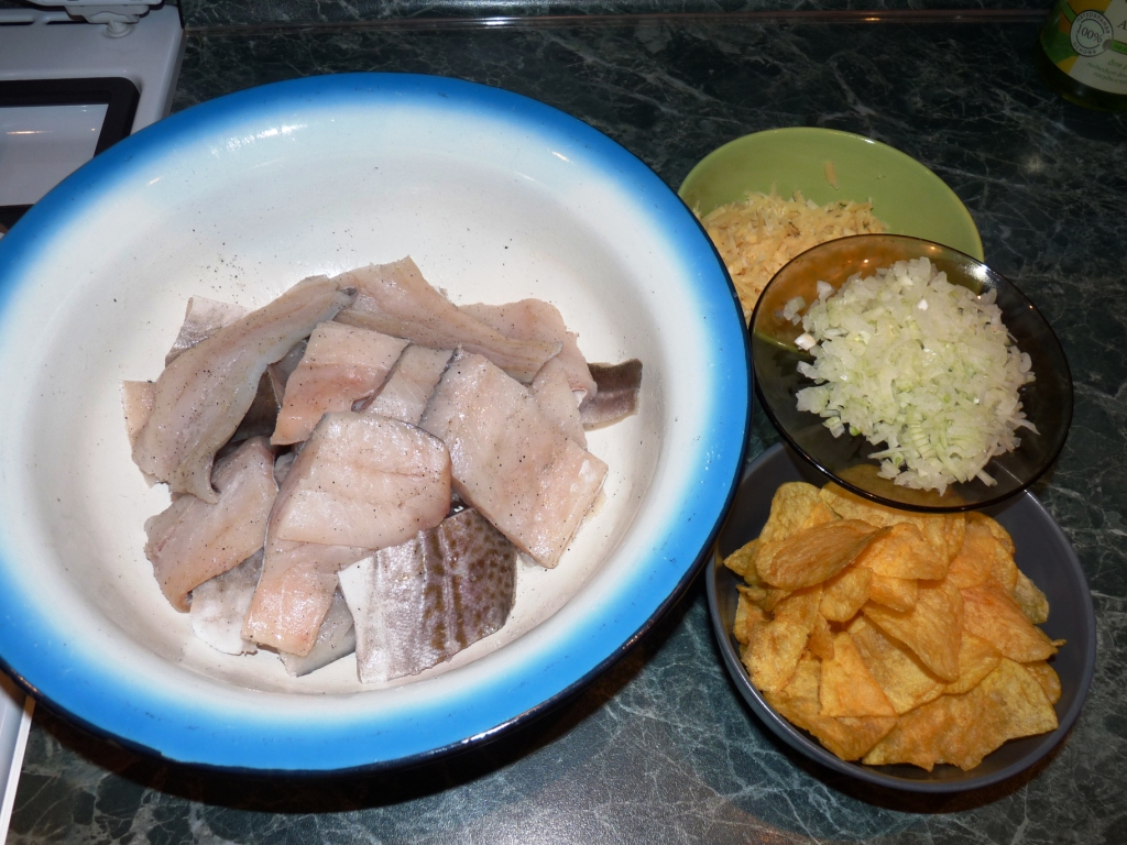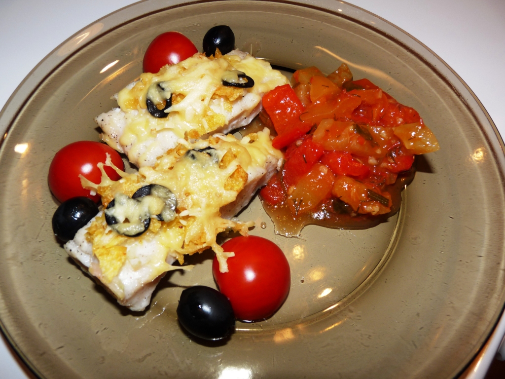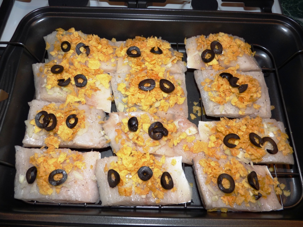 Рыба под сырно-картофельной корочкой. Рыба под сырно-картофельной корочкой. Чипсы картофельные — 85 гр. (средняя пачка). Филе трески на коже — 1 кг. Соль, перец — по вкусу Масло — 3 ст. ложки. Лук репка — 1 шт. Сок лимонный — 1/2 чайные ложки Сыр – 150-200 гр. Маслины и помидорки Черри для украшения. Для приготовления рыбного филе на кожице, нам понадобится противень с решёткой. Филе трески режем на порционные кусочки и кладём в миску. Добавляем по вкусу соль, перец, масло, сок лимона и маринуем минут 15. Тем временем разогрейте духовку до 200 градусов. Высыпьте чипсы и раскрошите их. Рыбу выкладываем на решётку кожицей вниз, посыпаем мелко порезанным луком, чипсами и порезанными на кружочки маслинами. Сверху тёртый сыр. Запекайте в духовке примерно 20 – 25 минут до готовности. Сервировать с сальсой… или домашним лечо! Приятного аппетита!