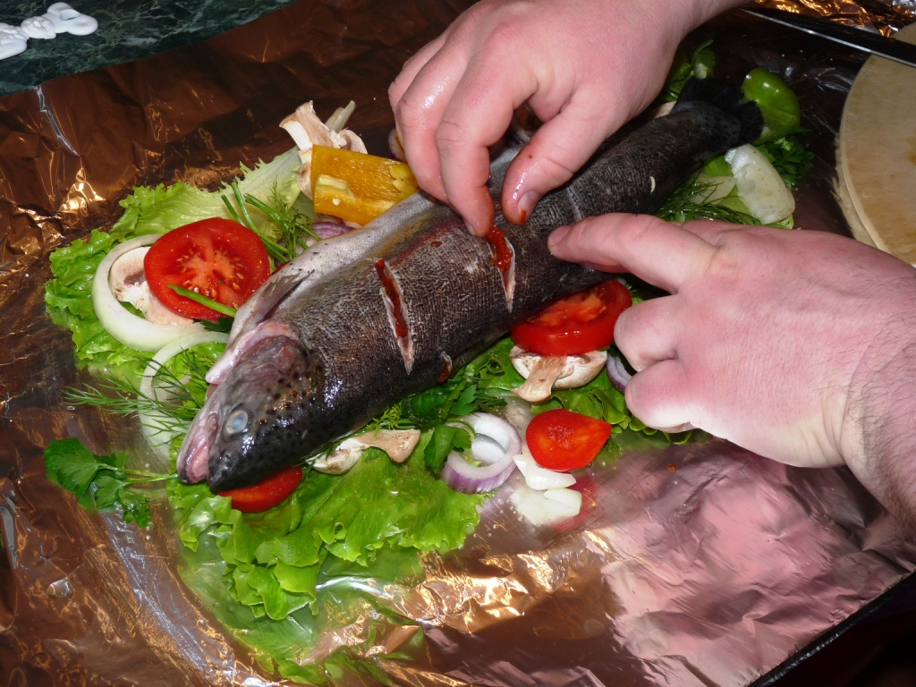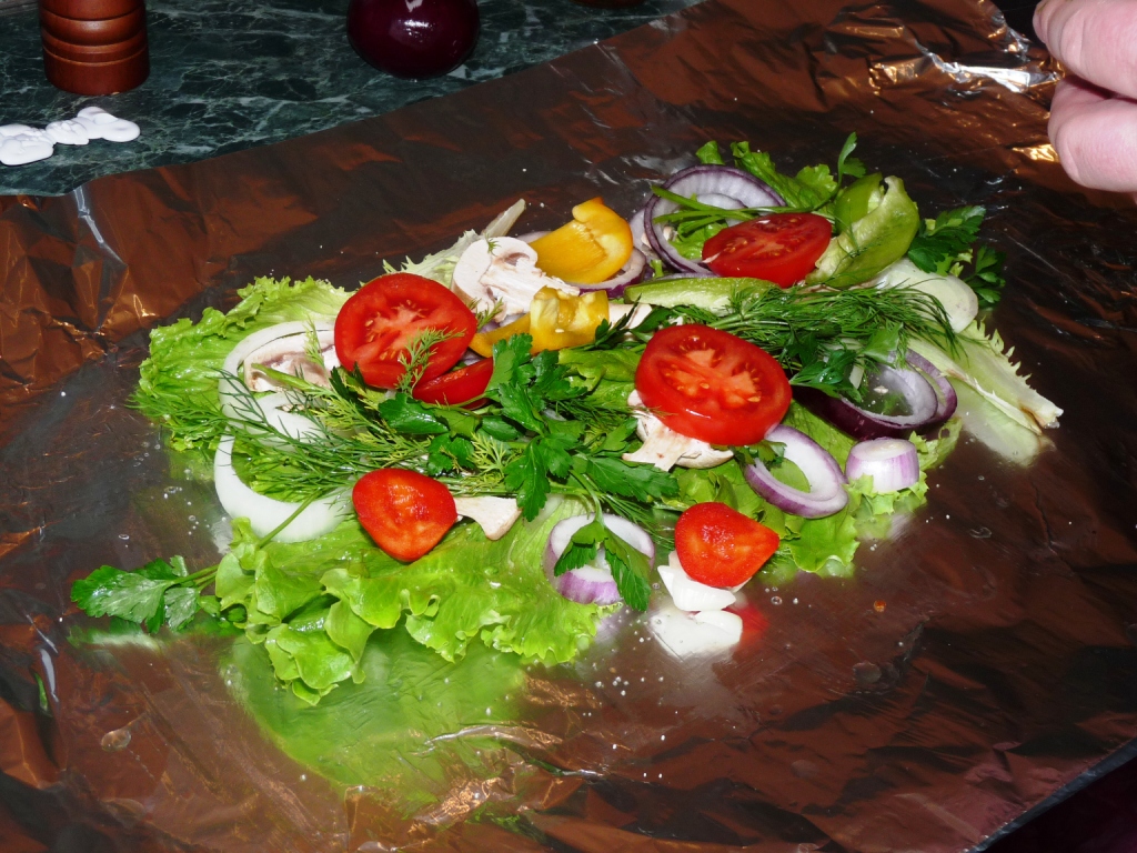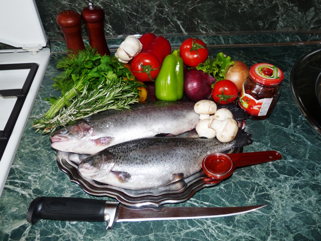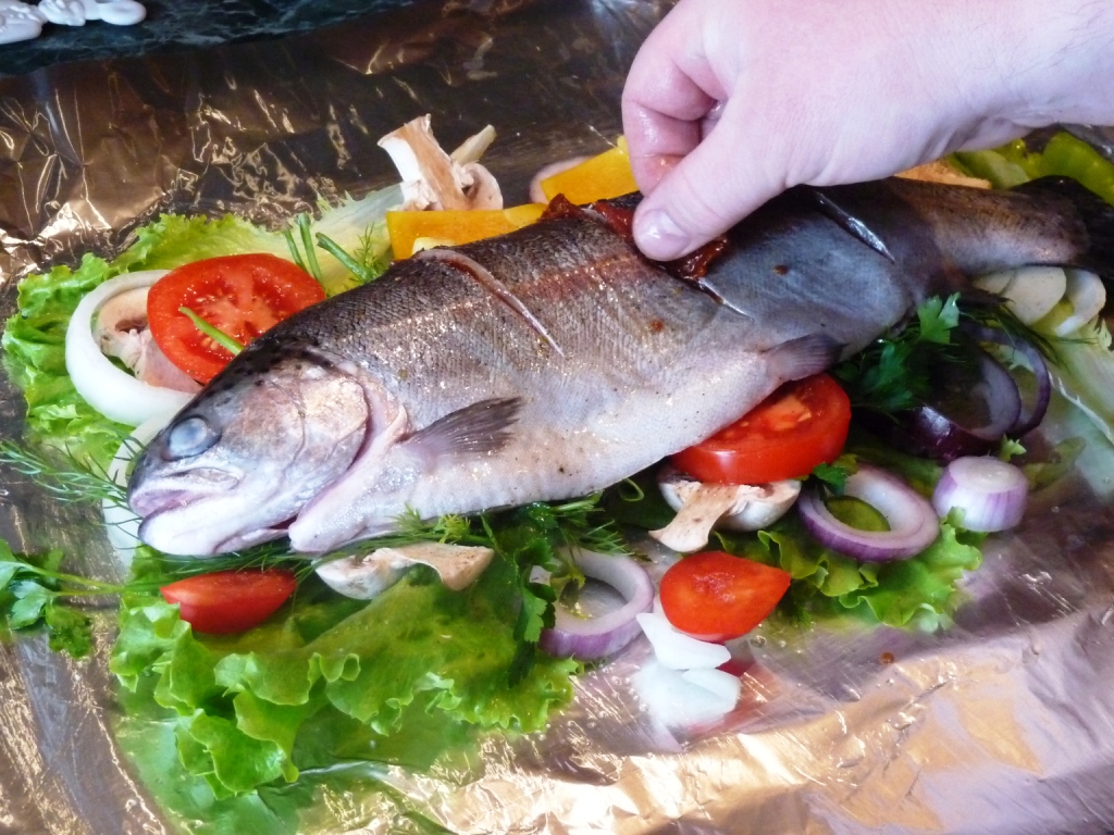 Форель с овощами. Форель с овощами. Форель – 1-2 шт. Перец болгарский – 3 шт. Помидоры – 5 шт. Шампиньоны – 5-6 шт. Укроп – 1 пучок. Петрушка – 1 пучок. Розмарин – 2 веточки. Вяленые помидоры Чеснок – 5 зубчиков. Морская соль. Перец Так уж получилось, что готовил я сегодня форель. Было у меня две форельки… одна с Левобережного, вторая, та, что поменьше с Медвежьего угла! У форели с Угла, как и ожидалось, мясо оказалось белое! Там почему то вся форель такая… Решил запекать в духовке. Для приготовления запеченной форели по классическому рецепту у меня не нашлось уорчестерского соуса, и пришлось просто запечь с овощами. Рыбу чистим, потрошим и обсушиваем на салфетке. Далее на рыбе делаем несколько надрезов и поливаем соком половинки лимона, солим и даём настояться минут 15-ть. Тем временем нарезаем овощи и грибы. Лист фольги смазываем небольшим кол-вом оливкового масла из вяленых помидоров, затем выкладываем листья салата, на салат порезанный кольцами лук, перец, грибы, зелень… всё солим и немного перчим. На овощи выкладываем нашу форель, также смазанную тем же маслом из помидоров. В разрезы закладываем вяленные помидоры, они придут рыбе свой аромат, в брюшко веточку розмарина, чеснок и немного вяленных помидорчиков. Сверху рыбу засыпаем оставшимися овощами и грибами. Всё заворачиваем конвертом и в разогретую до 220 градусов духовку на 35 минут! Блюдо получается очень сочным, красивым и вкусным! Сервируем и кушаем! Приятного аппетита.