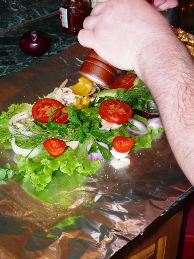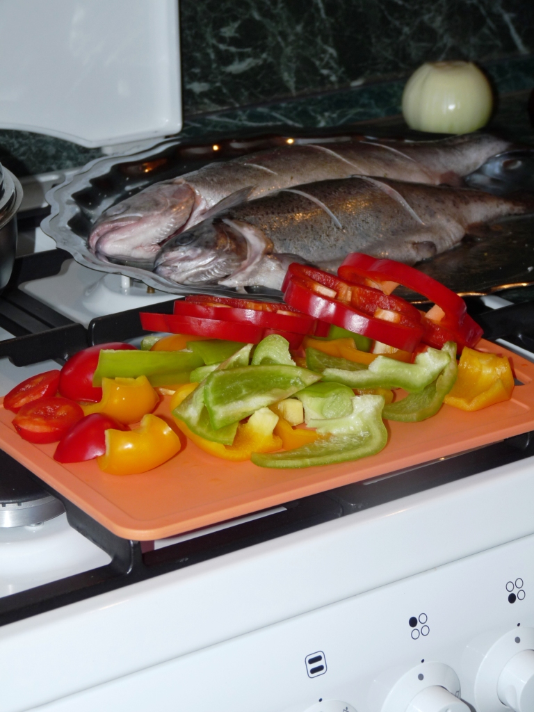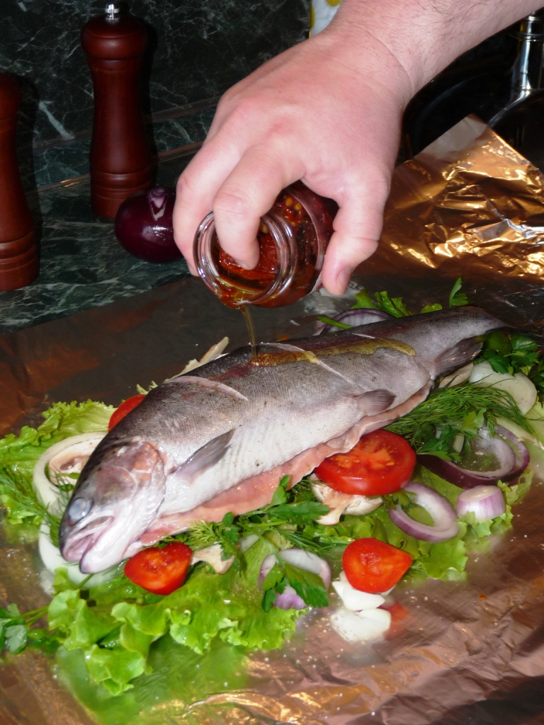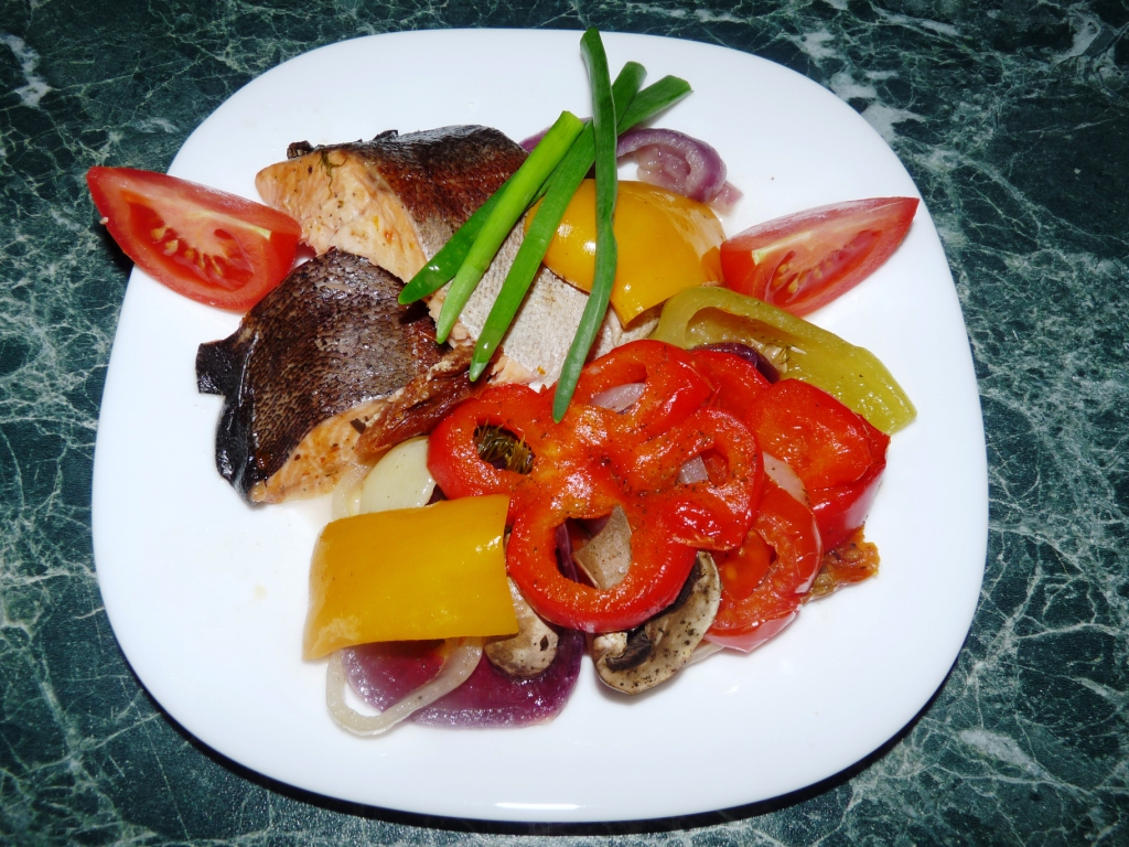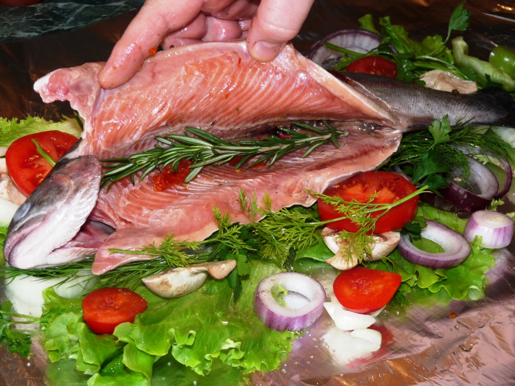 Форель с овощами. Форель с овощами. Форель – 1-2 шт. Перец болгарский – 3 шт. Помидоры – 5 шт. Шампиньоны – 5-6 шт. Укроп – 1 пучок. Петрушка – 1 пучок. Розмарин – 2 веточки. Вяленые помидоры Чеснок – 5 зубчиков. Морская соль. Перец Так уж получилось, что готовил я сегодня форель. Было у меня две форельки… одна с Левобережного, вторая, та, что поменьше с Медвежьего угла! У форели с Угла, как и ожидалось, мясо оказалось белое! Там почему то вся форель такая… Решил запекать в духовке. Для приготовления запеченной форели по классическому рецепту у меня не нашлось уорчестерского соуса, и пришлось просто запечь с овощами. Рыбу чистим, потрошим и обсушиваем на салфетке. Далее на рыбе делаем несколько надрезов и поливаем соком половинки лимона, солим и даём настояться минут 15-ть. Тем временем нарезаем овощи и грибы. Лист фольги смазываем небольшим кол-вом оливкового масла из вяленых помидоров, затем выкладываем листья салата, на салат порезанный кольцами лук, перец, грибы, зелень… всё солим и немного перчим. На овощи выкладываем нашу форель, также смазанную тем же маслом из помидоров. В разрезы закладываем вяленные помидоры, они придут рыбе свой аромат, в брюшко веточку розмарина, чеснок и немного вяленных помидорчиков. Сверху рыбу засыпаем оставшимися овощами и грибами. Всё заворачиваем конвертом и в разогретую до 220 градусов духовку на 35 минут! Блюдо получается очень сочным, красивым и вкусным! Сервируем и кушаем! Приятного аппетита.