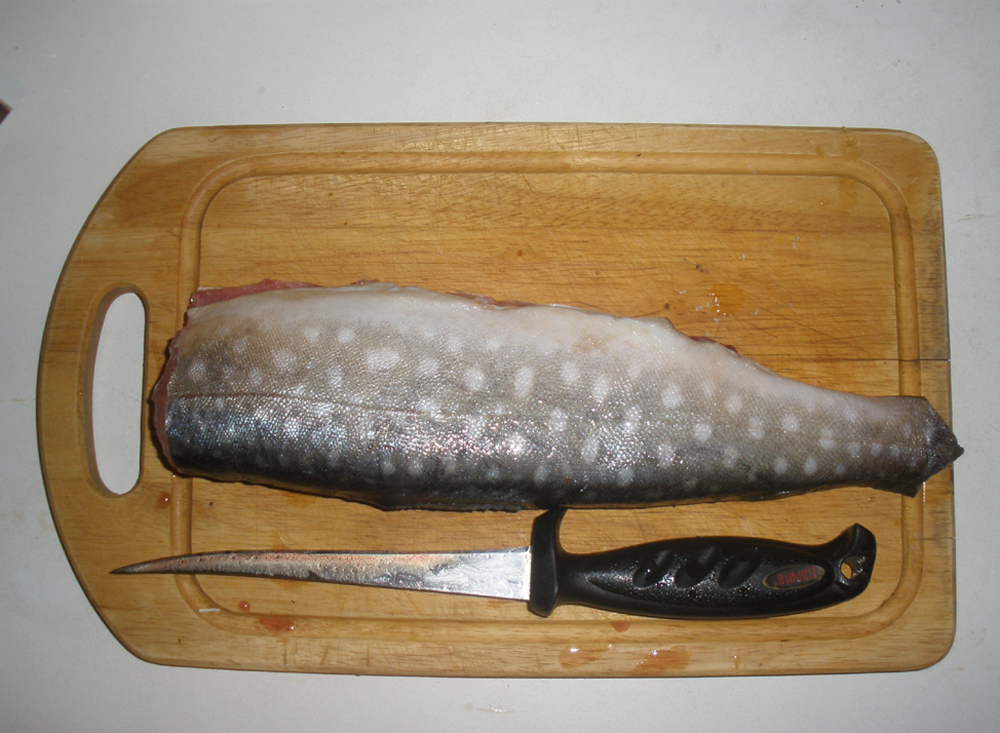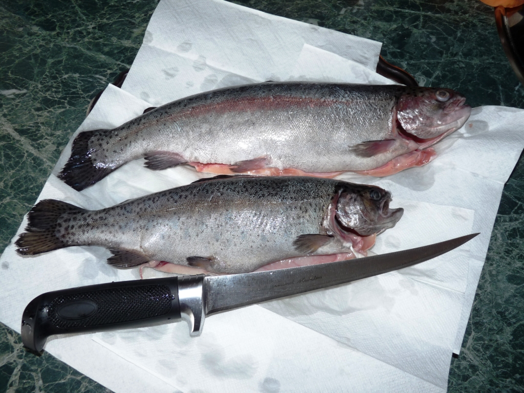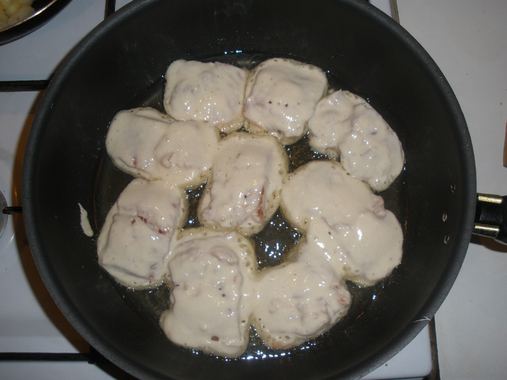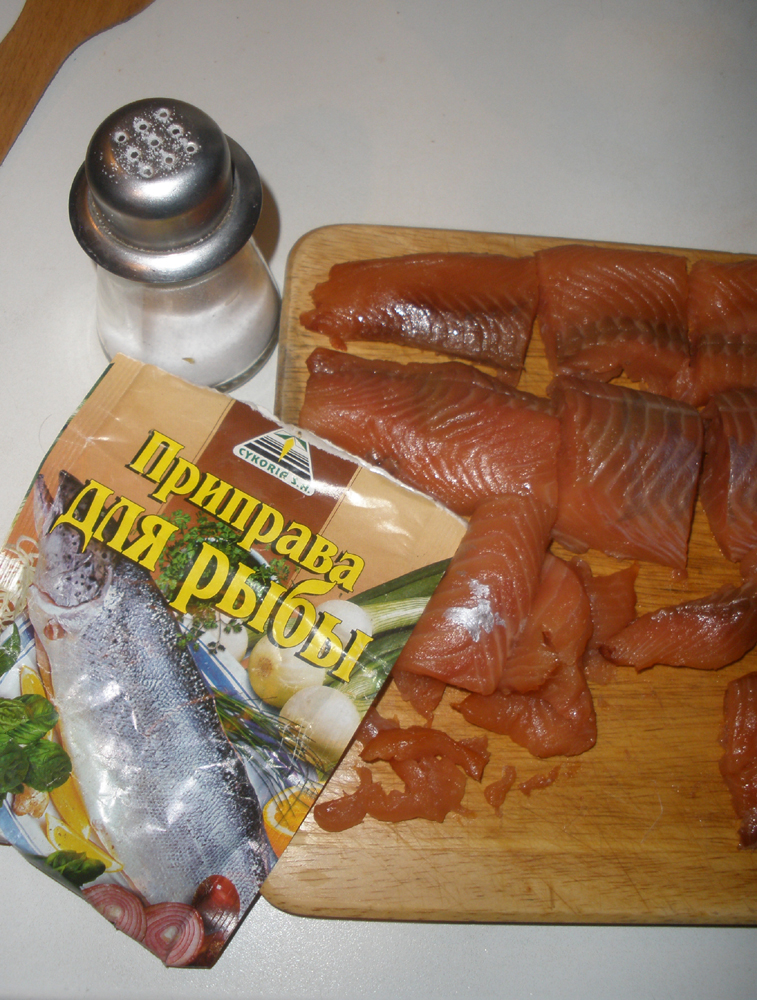Опя-я-ять форель... Да, если почитать нашу рецептуру, то будет явно заметно, что форель у нас самая популярная рыба в готовке... После зимнего то-ли-турнира, то-ли-фестиваля, то-ли-просто-пьянки старых знакомых, мне досталась халявная форель... Форель очень не хилая - 2400гр.! Готовить уже известными способами, было не интересно... Нашёл довольно простой способ и очень вкусный. Итак - филеруем, голову и хребет, можно заморозить - бульончик можно сварить! Удаляем мелкие кости. Режем на порционные кусочки и даём обсохнуть. Соль, перец, приправы по вкусу. Делаем тесто - молоко и блинная мука - как для оладий. Макаем кусочки рыбы и выкладываем на сковороду в разогретое масло. Обжариваем до румяной корочки. Готово! Подавать можно и в горячем и в холодном виде...