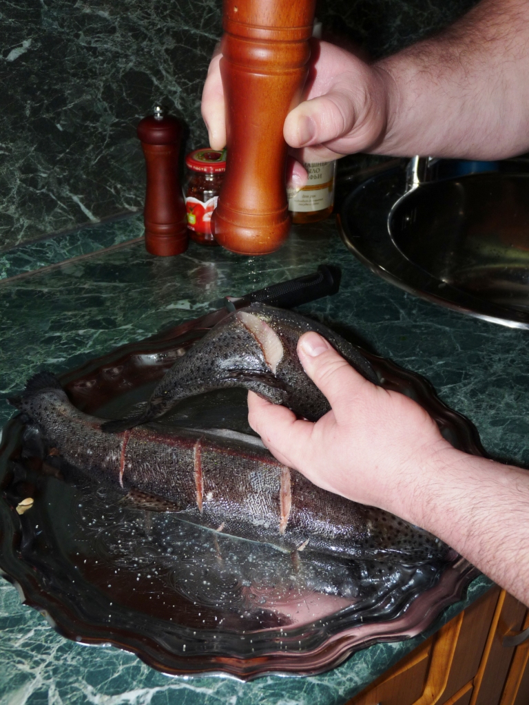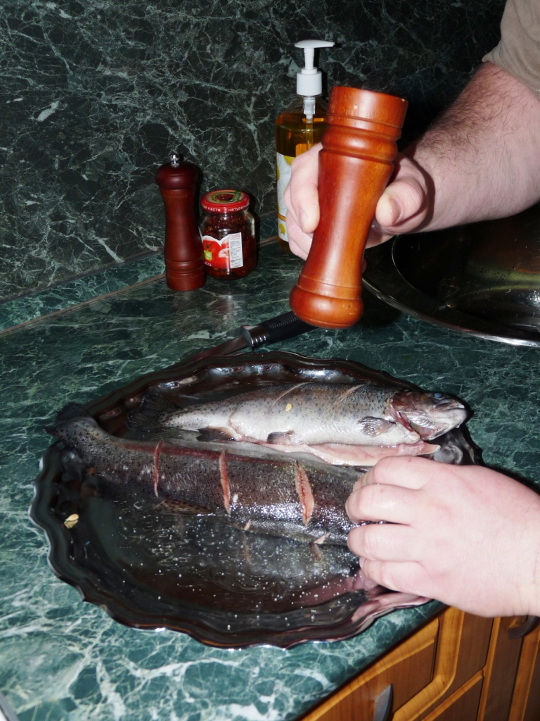 Форель в сметанном соусе Сегодня заехал на Химкинский колхозный рынок. Купить всяких солёностей. Есть там палаточка где всегда продают много видов всякой рыбы, приглянулась форелька, взвесили, получилось 1.600 по 299р за кило. Немного фантазии и получился такой рецепт: Банка сметаны 200гр Укроп сухой примерно столовая ложка Мука столовая ложка Молоко (по месту, специально не мерил) Гарнир: Картошка Лук Фотки не очень хорошо получились, айфоном делал... Форель в сметанном соусе Для соуса нужна сметана, мука, укроп и конечно соль и перец. Почистить картошку и лук Картошку крупно порезать и выложить вместе с рыбой на разогретый протвень Сверху посыпать луком, лука можно побольше, рыба его любит, а кто не любит можно выкинуть после готовки Залить сметанным соусом который приготовить смешав укроп, сметану и муку разбавив молоком. Потом накрыть фольгой и на 30 минут в духовку. Температура 230. Через 30 минут снять фольгу и еще минут на 10 в духовку или под гриль для румяной корочки