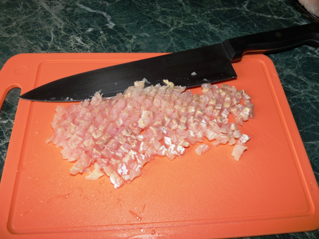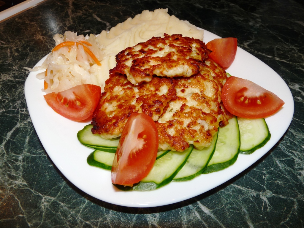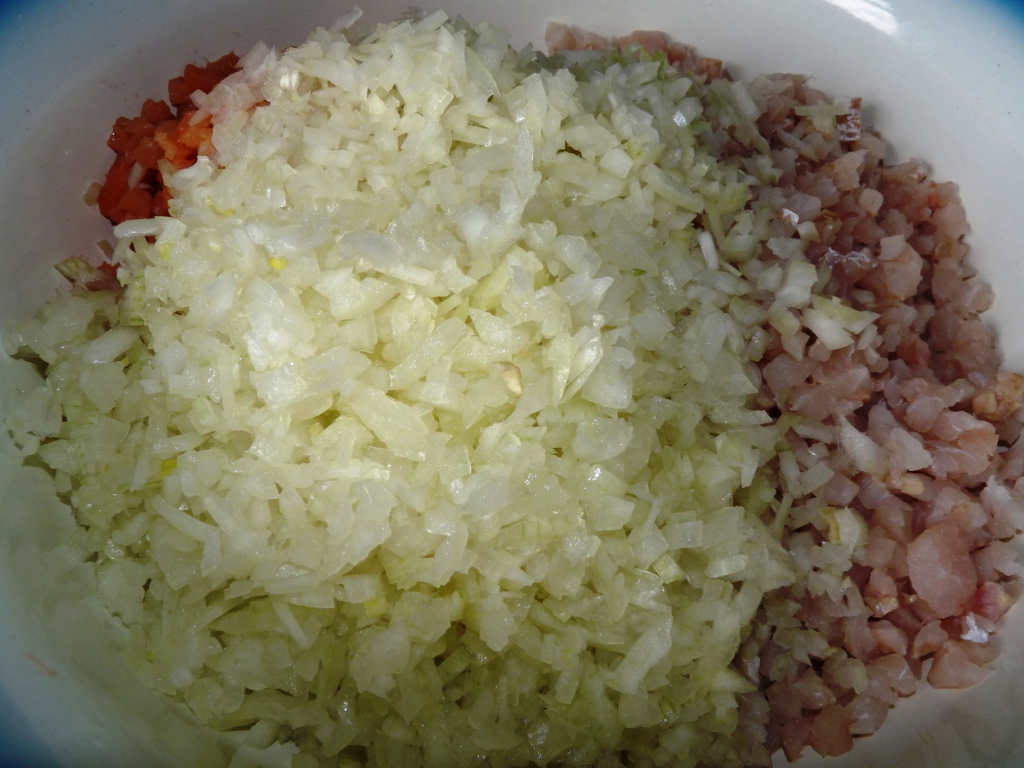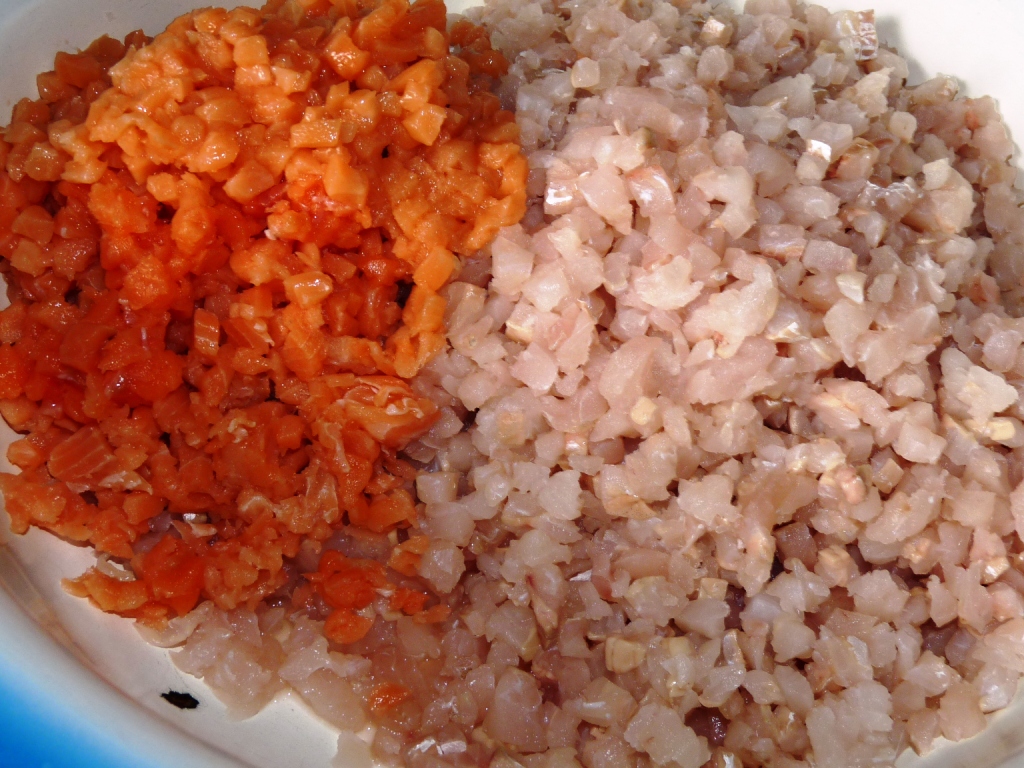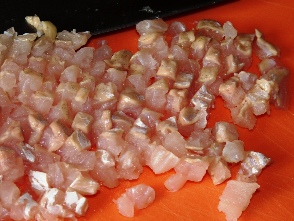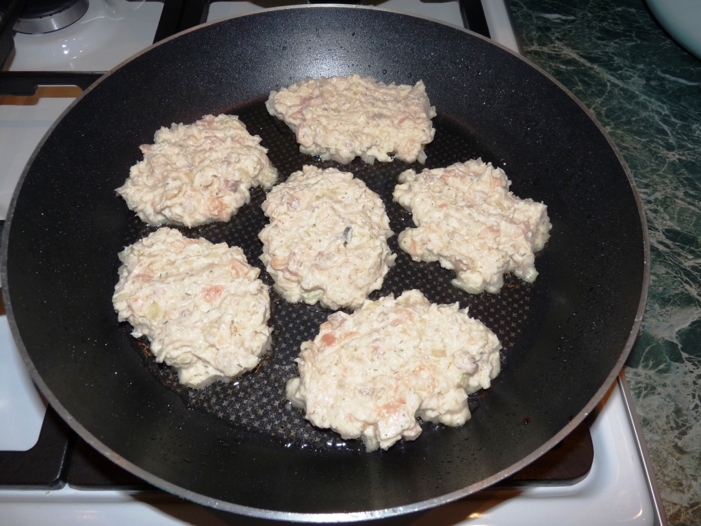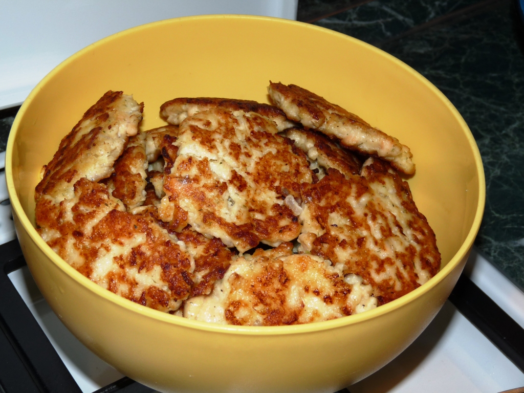 Оладьи... Оладьи рыбные. Сразу оговорюсь, что именно таким способом я готовлю оладьи из куриных грудок. И постоянно нарезая куриное филе, думал, что и с рыбой будет вкусно! И вот сегодня воплотил в жизнь этот экспериментальный рецепт! Исходные продукты: Филе рыбное - 1.100 кг. Филе трески + 300 гр. Мяса сёмги. Лук репка - 4 шт. Чеснок – 3 зубчика. Майонез – 470 мл. Крахмал – 1 ст. ложка. Мука – 4 ст. ложки. Соль, перец. Ваши любимые специи по вкусу. Филе нарезаем маленькими кубиками, именно нарезаем, а не прогоняем через мясорубку! Процесс кропотливый, но это того стоит! Также шинкуем лук. Добавляем все специи, соль, перец, чеснок (через давилку), крахмал и вмешиваем майонез. В случае с куриным филе ложки крахмала было достаточно, но для рыбы такая пропорция не подошла, и пришлось добавить муку. Всё тщательно перемешиваем и оставляем часа на три мариноваться. После жарим оладьи на масле до готовности.