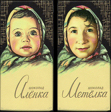Кстати я видел эту девочку с шоколадки. В конце 90-х повадились заезжать в одну кафешку в Химках, тетки стараются, вкусно кормят, весёлые:) Купил шоколадки "Алёнка" и в очередной приезд подарил, а они смеются и "Лену" зовут:) Конечно не похожа, я так думаю, что ей тогда лет под 40 было, да и жизнь её потрепала... Вот и рассказала, что папа у неё работал там художником и эту "Алёнку" рисовал с нее. Может её и не Леной звали, сейчас уже не помню.