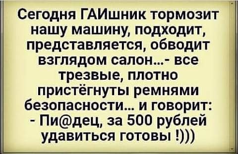 Рыбинспектор задерживает мужика с двумя ведрами рыбы на берегу реки. Рыбинспектор спрашивает у мужика: - У Вас есть разрешение на отлов такого количества рыбы? Мужик: - Нет. Но оно мне не нужно. Это моя домашняя рыба. Рыбинспектор: - Домашняя? Как это? Мужик: - Ну, кто-то держит собак, кто-то попугаев, а я - речную рыбу. Каждый вечер я привожу их сюда, чтобы выгулять. Я выпускаю их в воду, они себе плавают. А потом я подаю им сигнал и они возвращаются ко мне. Я кладу их в ведра и мы едем домой, в аквариум. Рыбинспектор: - Ерунда! Рыба не может такого делать! Мужик: - Не верите? Я могу показать. Вот смотрите... С этими словами мужик подходит к воде и переворачивает одно за одним оба ведра. Сам остается на берегу в ожидании. Через несколько минут Рыбинспектор не выдерживает: - Ну?! Мужик: - Что ну? Рыбинспектор: - Когда ты их позовешь назад? Мужик: - Позову кого? Рыбинспектор: - Рыб!!! Мужик: - Каких рыб?! Ты ебанутый что ли?!