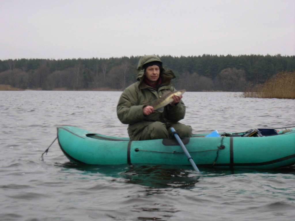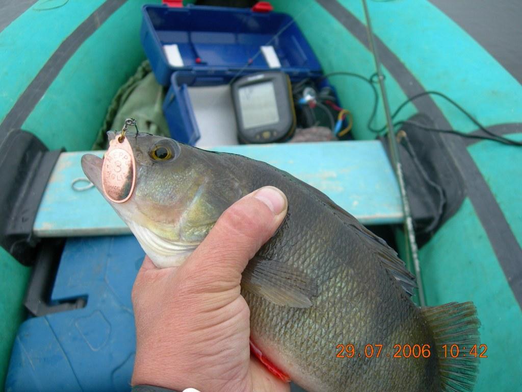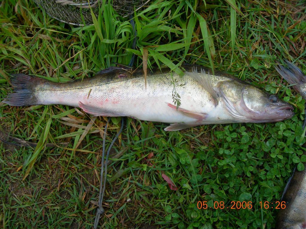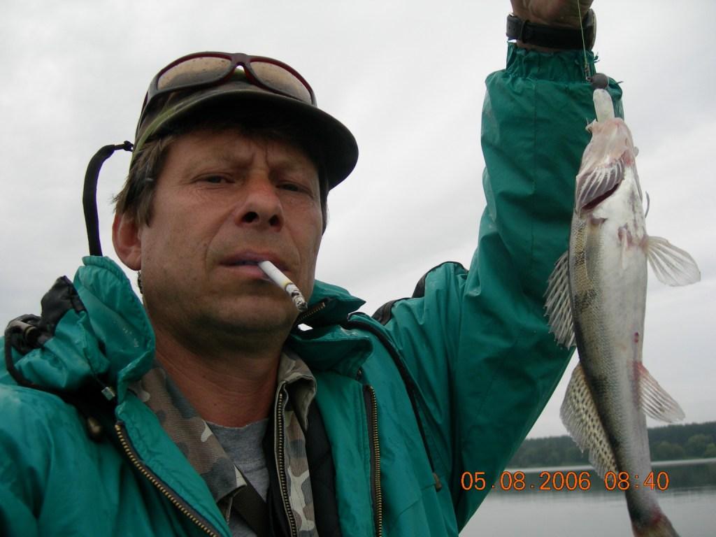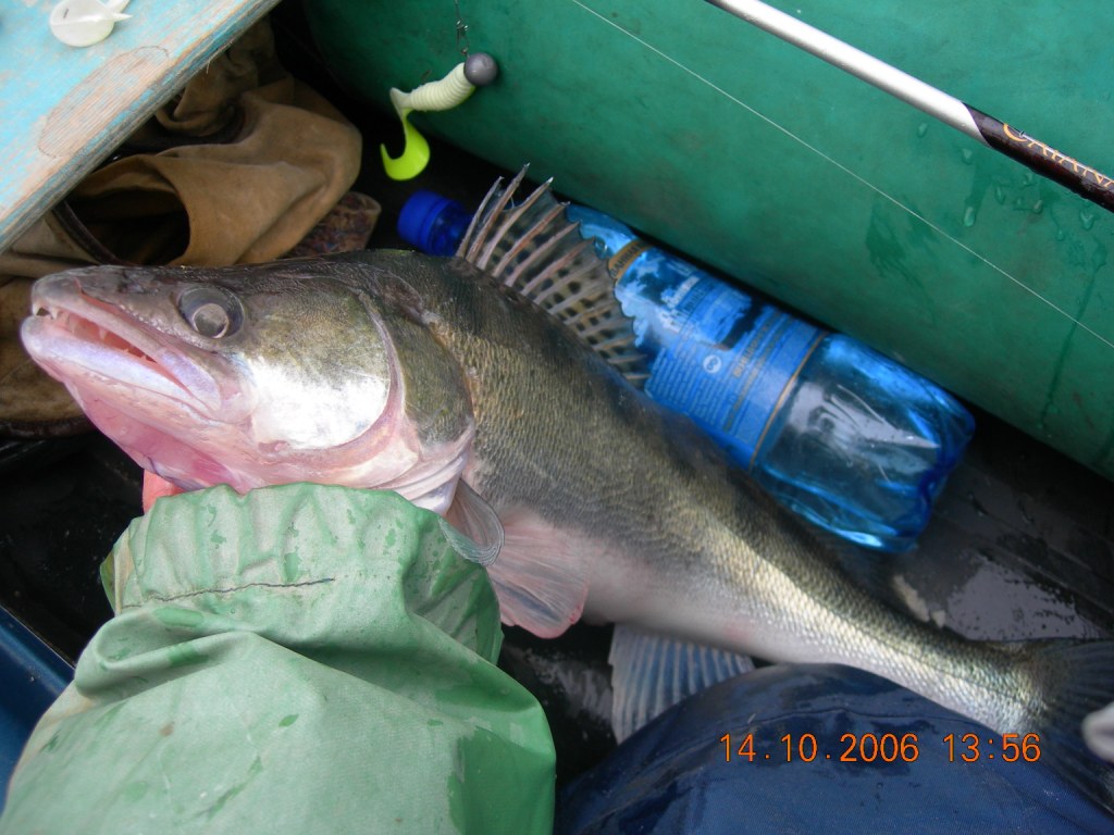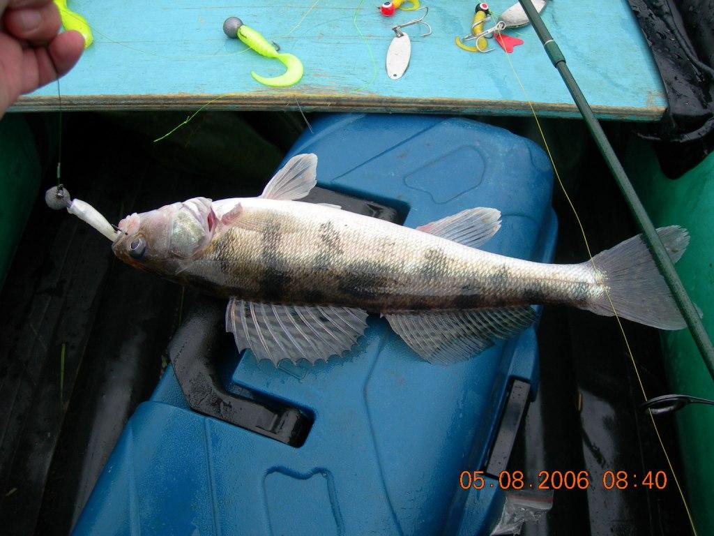 Судачек Сегодня снова посетил свои места.Пишу быстрее отчет, а то Валерман приедет с рыбалки, наловит много рыбы, на мой отчетик и смотреть не будут.Погода с утра не жаловала, поехал на машине в дождь.Ветер тоже дул приличный.По заливам начал облавливать с помощью моего воблерочка.Поймал два окушка и все.Выплывал на глубину, но тоже ни одной поклевки.Кружился, кружился-тишина.И около 14 часов встал на свое судачье место.Ну и что, поклевка...., подсечка...мимо.Вытаскиваю твистер, а он без хвоста.Снова продолжаю забросы, и снова легкая поклевка...Подсек, ну вроде зацепил.Пару оборотов катушки и тяжесть пропадает, сошел(я чувствовал, что рыбина небольших размеров).Снова заброс подсечка, попался, да и тяжеленнький такой.Тащил выкачиванием, но рыбина сопротивлялась вяло.Судак ничего вроде. Посмотрел ,что сидит он на крючке нормально и я аккуратненько взял его ручкой и в лодку.Потом начал фоткать,курить, короче минут через пять только сделал очередной заброс, но увы больше поклевок небыло.Хотя для меня такой судачек-тоже большая удача! Вес-1650гр.