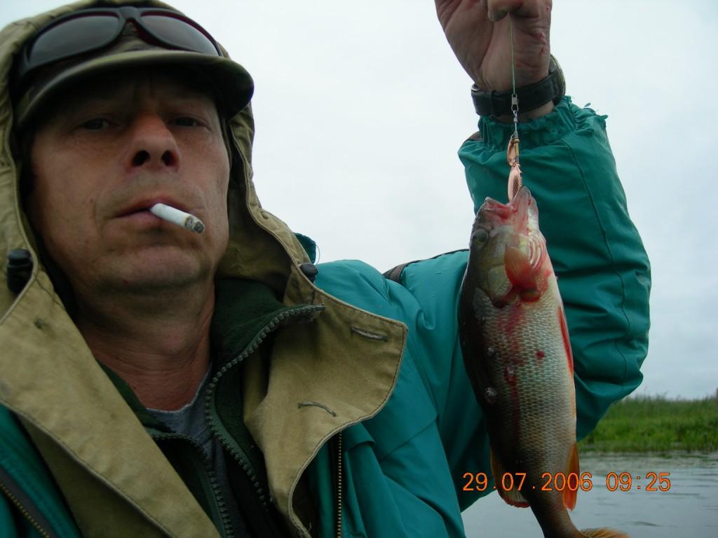 Сигареты Привет всем ! Утром пошел в гараж , но в спомнил , что забыл сигареты.Сам то я готовился снова половить на удочку, но то что пришлось заезжать домой, где мой заветный чемоданчик, решил половить на спининг.Погода ветренная и прохладная, но это давало шанс попасть на хищника, который после жары должен зашевелится.На стоянке , на Волге сфоткал меня товарищ не катере, правда на суше.Далее поплыл я по своему курсу.В заливе , перед Волгой заметил, что плещется малек, прячась от ветра и волн .Первые забросы принесли одного малюсенького окушка и щюреночка.Переплыл еще дальще, где ветра почти не было и тут стал мне попадатся хороший окунь,садился он на медного цвета "Мепс" №3.Вертушка для наших мест считается крупной.Попробовал еще вертушку"аглия лонг" мепс, она по дальнобойнее и при первом же падении хватает ее , я думаю жерешок, так как я их не ловил еще, утверждуть не буду, гляньте фото, прав я или нет.Отпустил я его подрастать.К обеду клев стих и я поплыл на русло , покидать джиг.Два раза чувствовал небольшие потычки.Глубина 10 метров.Еще заброс и что то село на мою снасть.Стал потихонечку вытаскивать рыбку(а в голове вертится-щука или судак?)Подтаскиваю к лодке и первые мгновения не понимаю , что за рыбина....ба -сомик!Ловлю без подсачнека и не знаю как его лучще в лодку принять, ватащил.Второй сомик в жизни у меня, но в этом месте сом -редкость, даже и разговоров про него нет.Удача!Поплавал еще немного, волна, ветер-пора и к дому плыть.Да ,сомик весил 1 кг. 400гр.